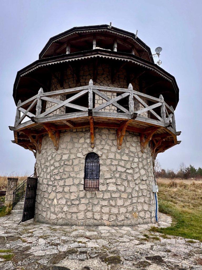 Podchodzimy dosyć wysoko co chwilę oglądając się za siebie na panoramę Krasnobrodu. Po chwili przed nami mamy murowaną, przysadzistą, przypominającą zamkową basztę, ale niewysoką wieżę widokową. Podobną można spotkać choćby w Suścu. Na Roztoczu znajdziemy ich więcej, ale nie na wszystkich już byliśmy. W dole wieży znajdziemy mały sklepik z pamiątkami.