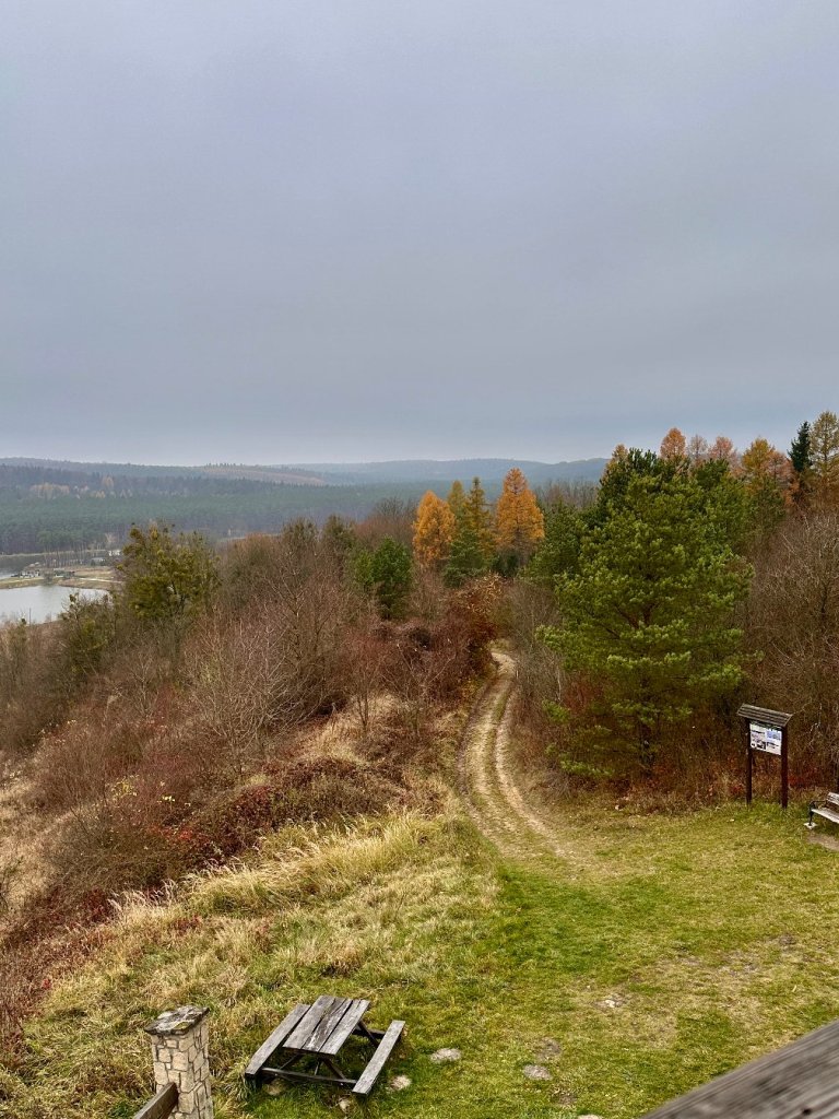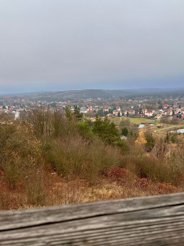 Na koniec dnia decydujemy się by zobaczyć wieżę widokową, która jest około 5 minut jazdy od parkingu leśnego pod rezerwatem Święty Roch. Wieżę wybudowano w 2002 roku na szczycie kamieniołomu. Czytaliśmy, że w tych skałach zachowały się odciski fauny i flory sprzed milionów lat. Przywołało to wspomnienia kamieniołomu ze śladami tetrapoda.