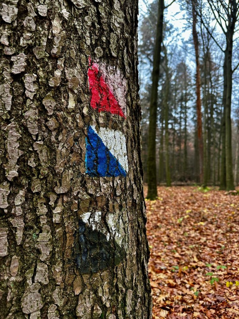 Skręcamy w czerwoną ścieżkę, mijając niemal niewidoczne oznaczenie niebieskiego szlaku, zatarte i porośnięte mchem. Z daleka słychać ptaki, ale nie widać żadnego człowieka.
