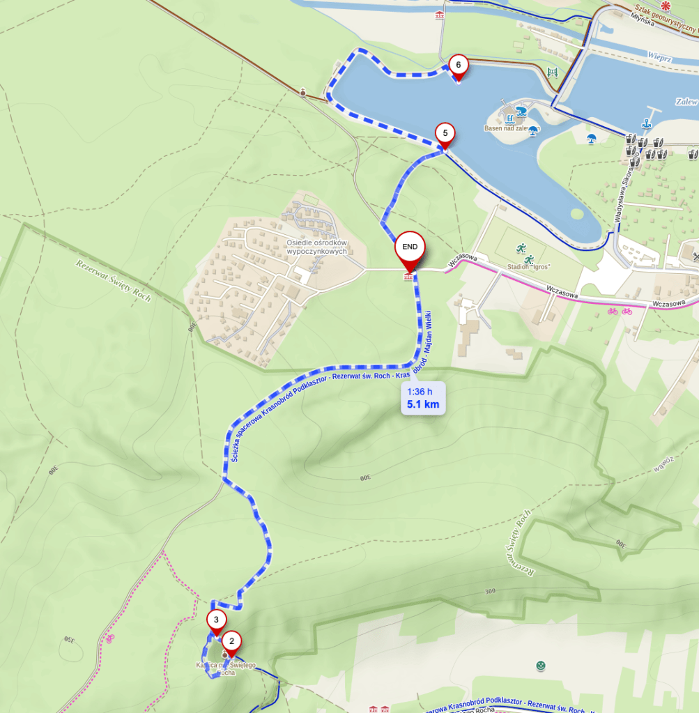 Trasa: Parking – Kierujemy się ścieżką głębiej w las i podążamy za wskazaniami szlaku niebieskiego – Do kaplicy można dostać się schodami na lewo i na prawo – Kaplica – Powrót do parkingu – Przechodzimy na drugą stronę jezdni i poruszamy się leśną ścieżka – Idziemy zgodnie z oznaczeniami szlaku niebieskiego aż dojdziemy do zalewu – Nad zalewem skręcamy w lewo i idziemy cały czas chodnikiem – Docieramy do molo – Wracamy tą samą drogą do parkingu – Parking