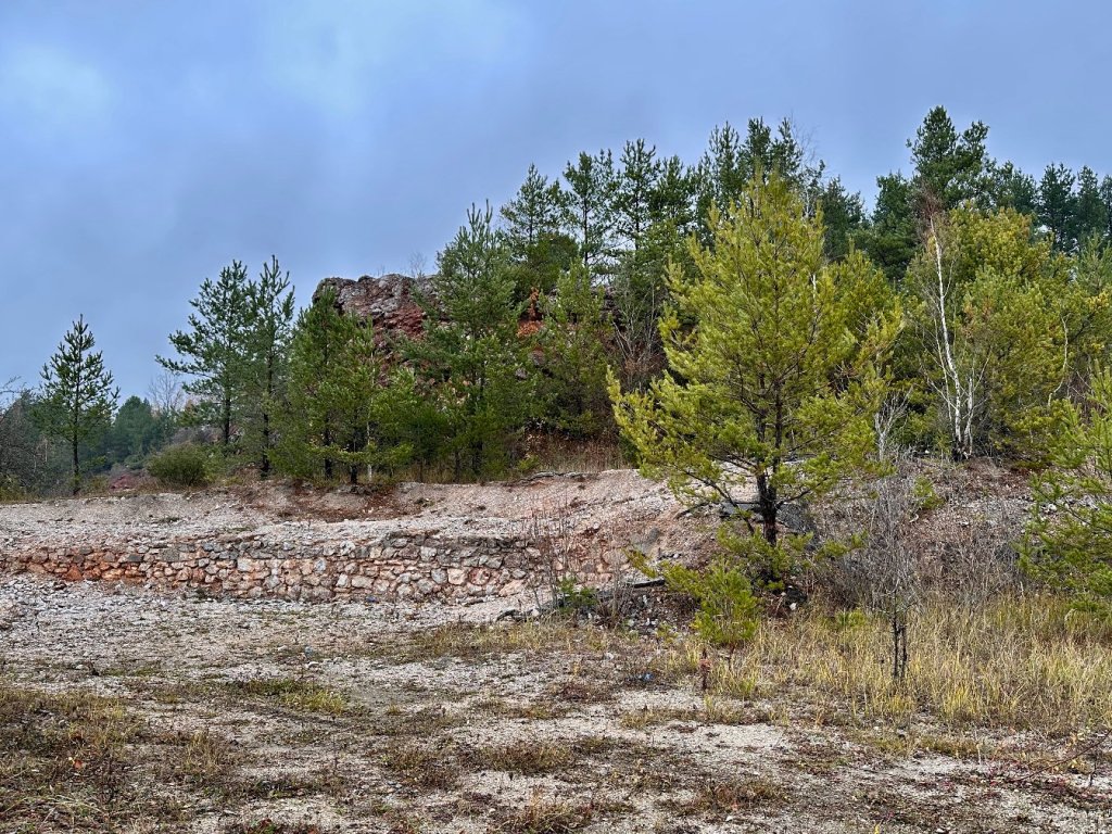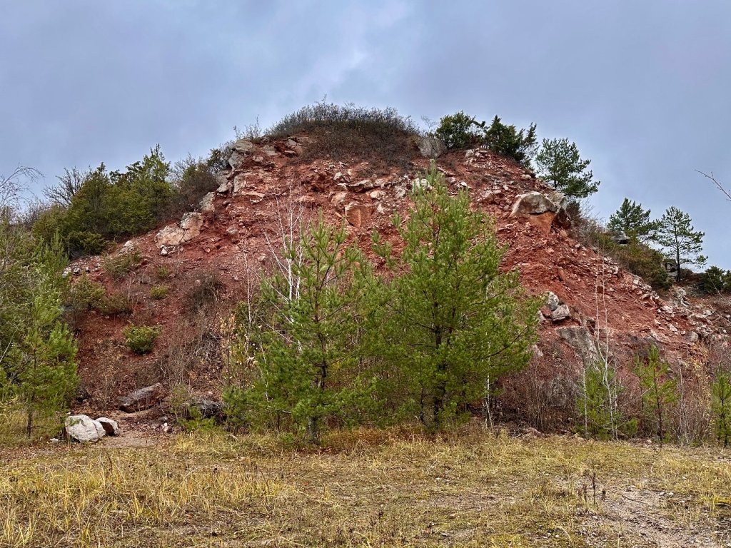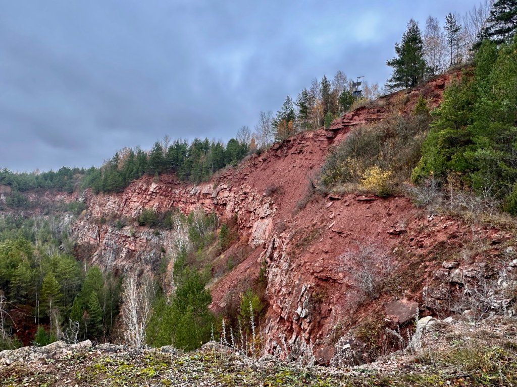 Kilka kroków dalej jest brzeg kamieniołomu, skarpa, z której można zobaczyć czerwone, monumentalne ściany kamieniołomu. W dole rosną drzewa, tworząc warstwę zieleni na dnie starego wyrobiska.