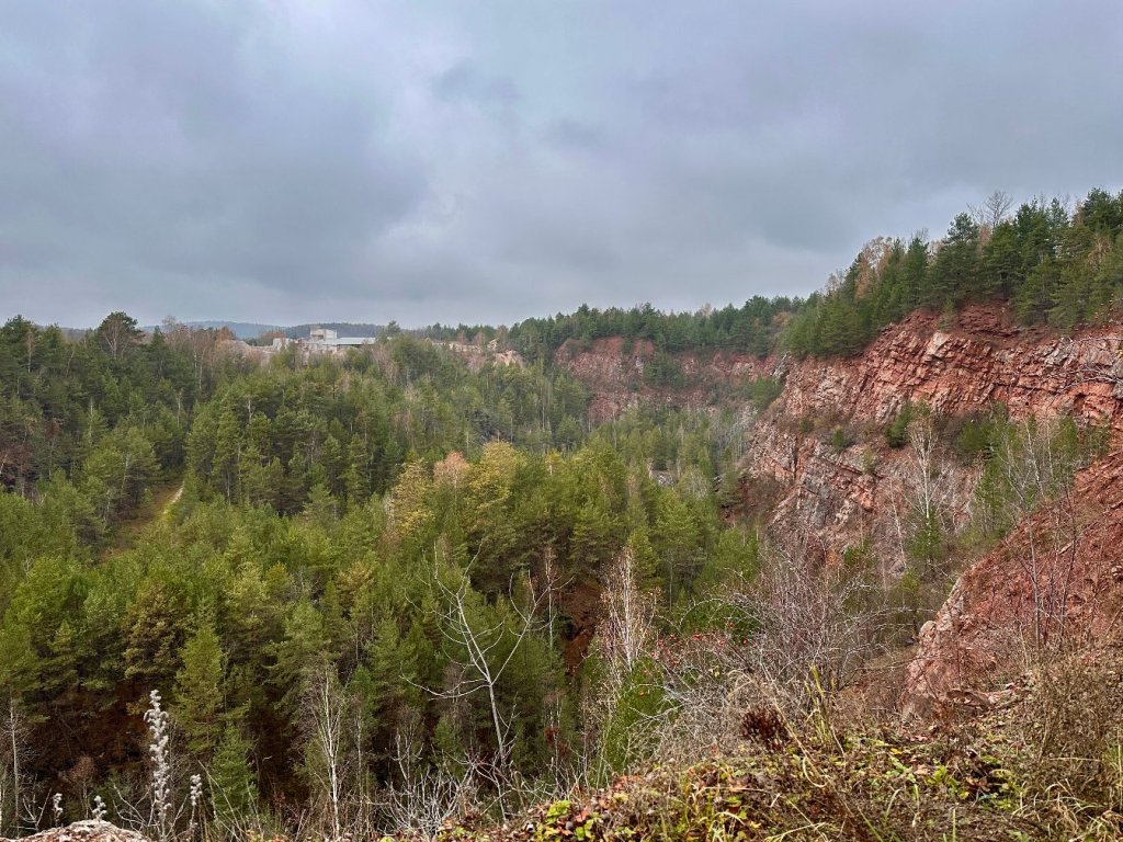 W oddali dostrzegamy czynny kamieniołom, gdzie nadal prowadzone jest wydobycie. Czerwień skał kontrastuje tu z ciemną zielenią iglaków, które wyglądają jak miękkie poduchy przyklejone do skalnych ścian.
