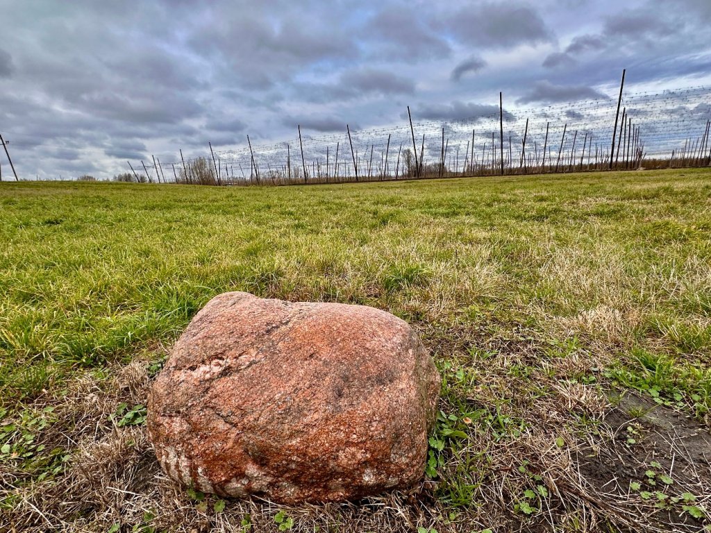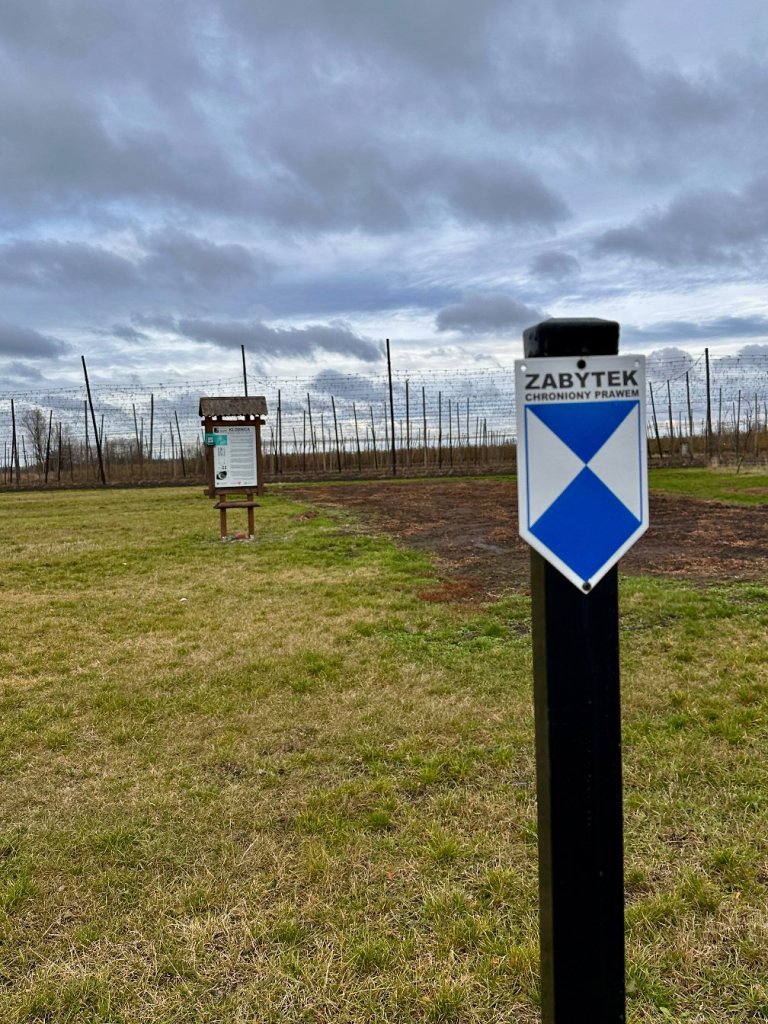 Widać niewielkie wzniesienie i tabliczkę informacyjną, na pierwszy rzut oka miejsce wygląda bardzo skromnie. Po jednej stronie pola uprawne, po drugiej sady, a dla pełni listopadowego klimatu, wiatr, który wciska się pod kurtkę oraz mżawka rysująca drobne, zimne punkty na ubraniach.