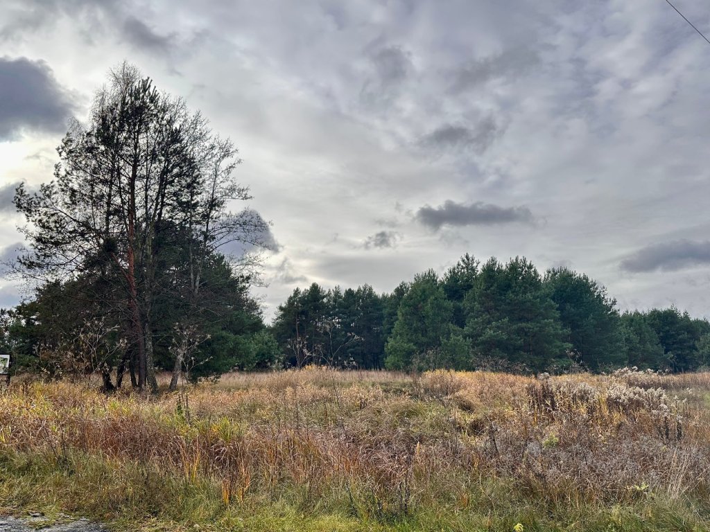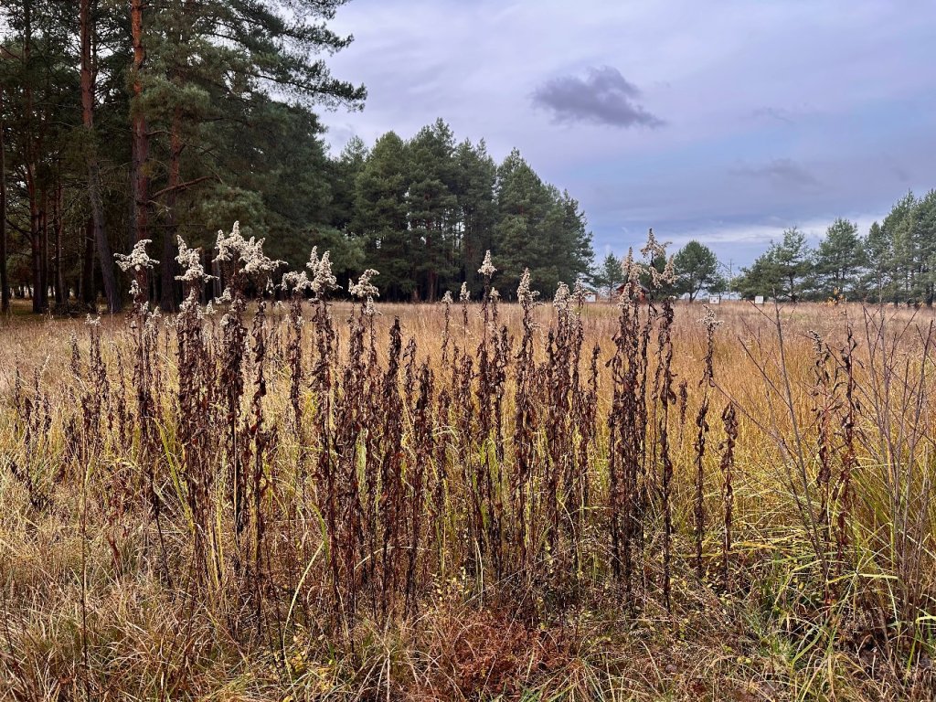 Zaczynamy od tabliczki informacyjnej, a dalej prowadzi szeroka leśna droga otulona suchymi trawami i niskimi sosnami. Mżawka staje się coraz drobniejsza, jakby powietrze po prostu było mokre z każdej strony.