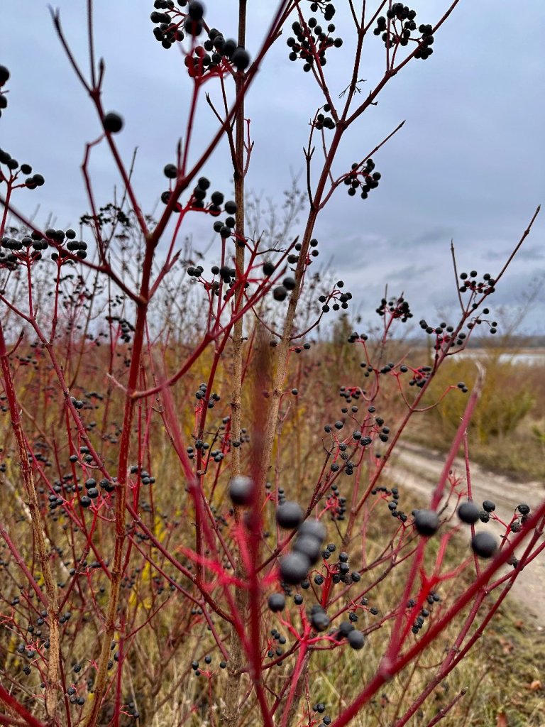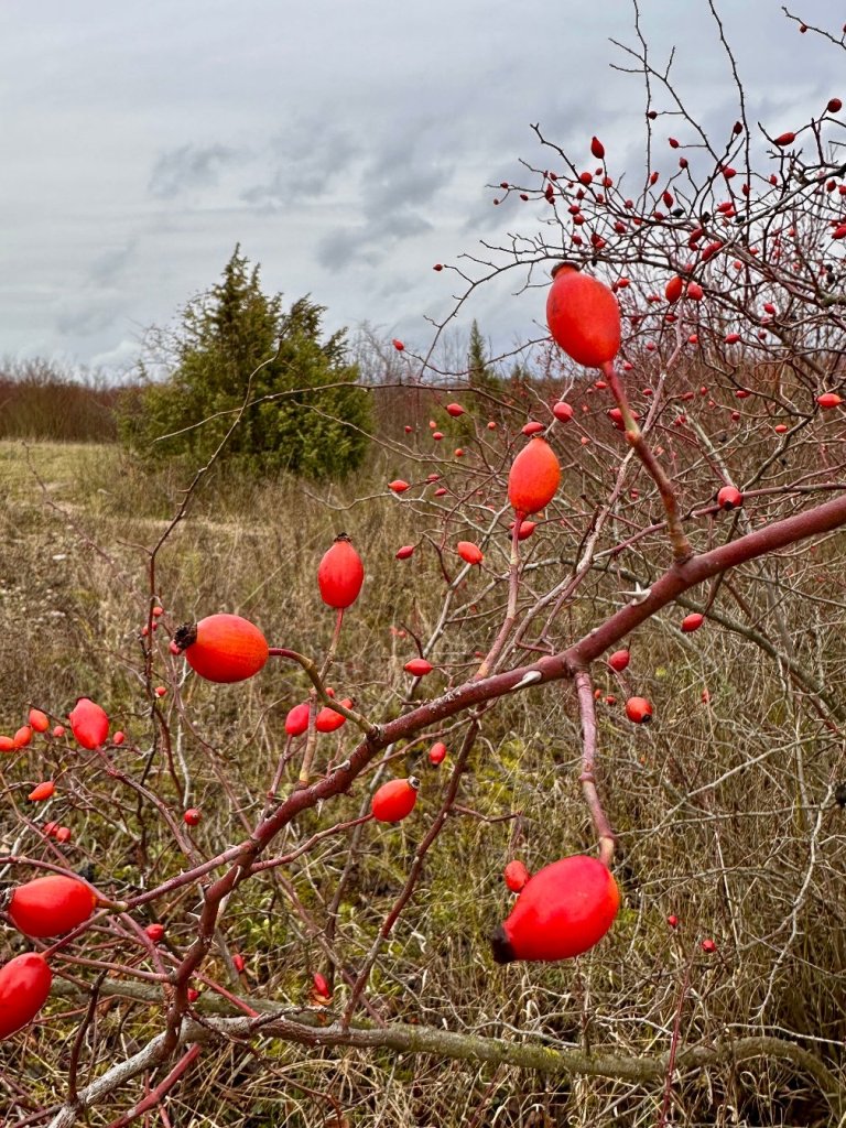Mżawka osiada nam na kurtkach. Wśród nagich drzew wyróżniają się czerwone owoce dzikiej róży i czarne jagody ligustru. Na niektórych gałęziach widoczne są jasne porosty, które kontrastują na tle szarego nieba.