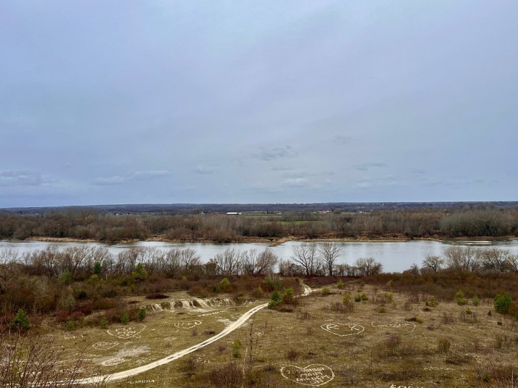 W dole dostrzegamy ułożone z kamieni napisy, z góry wyglądają wyraźnie, ale z bliska okazały się mniej czytelne. Idziemy górnym brzegiem kamieniołomu, spoglądając na panoramę Wisły, co raz zaglądając w dół i pozwalając sobie przystanąć.