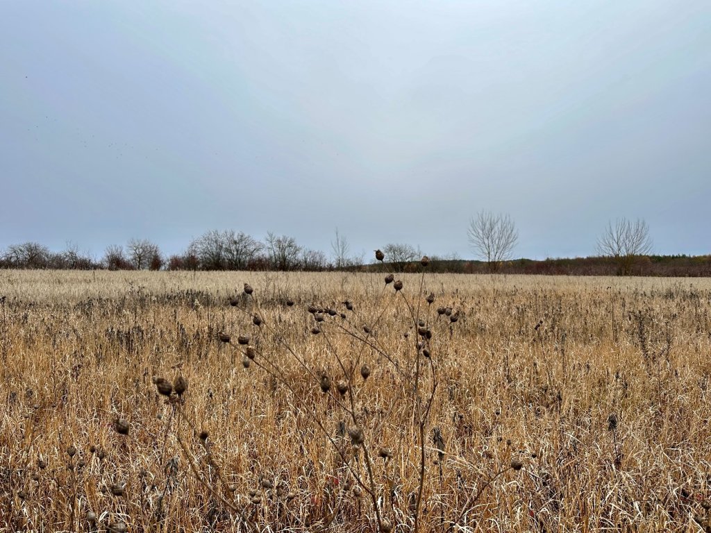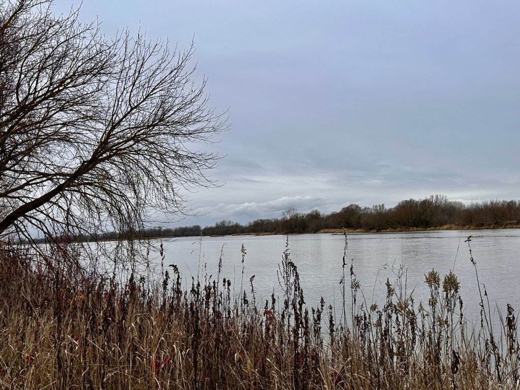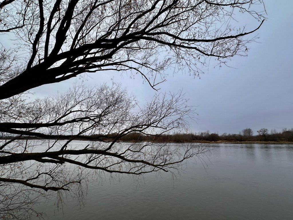 Kolory są niemal monochromatyczne, szare niebo, szara woda, poszarzałe trawy. Przystajemy na chwilę, patrząc, jak woda płynie powoli, jakby sama zwalniała na ten listopadowy moment.