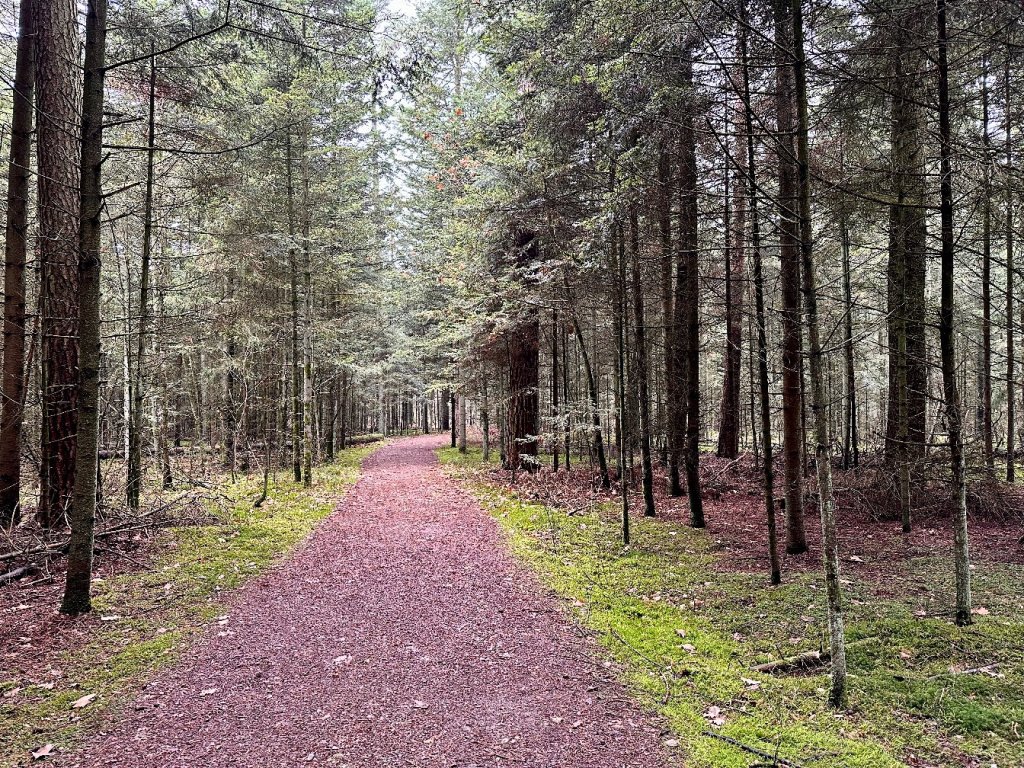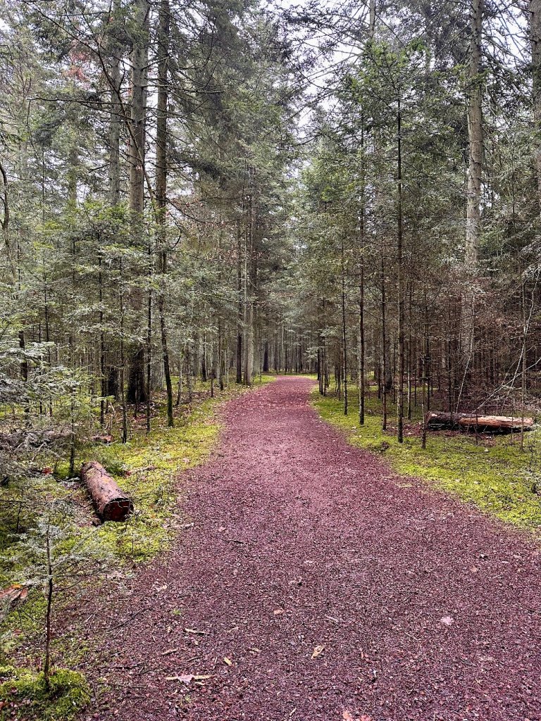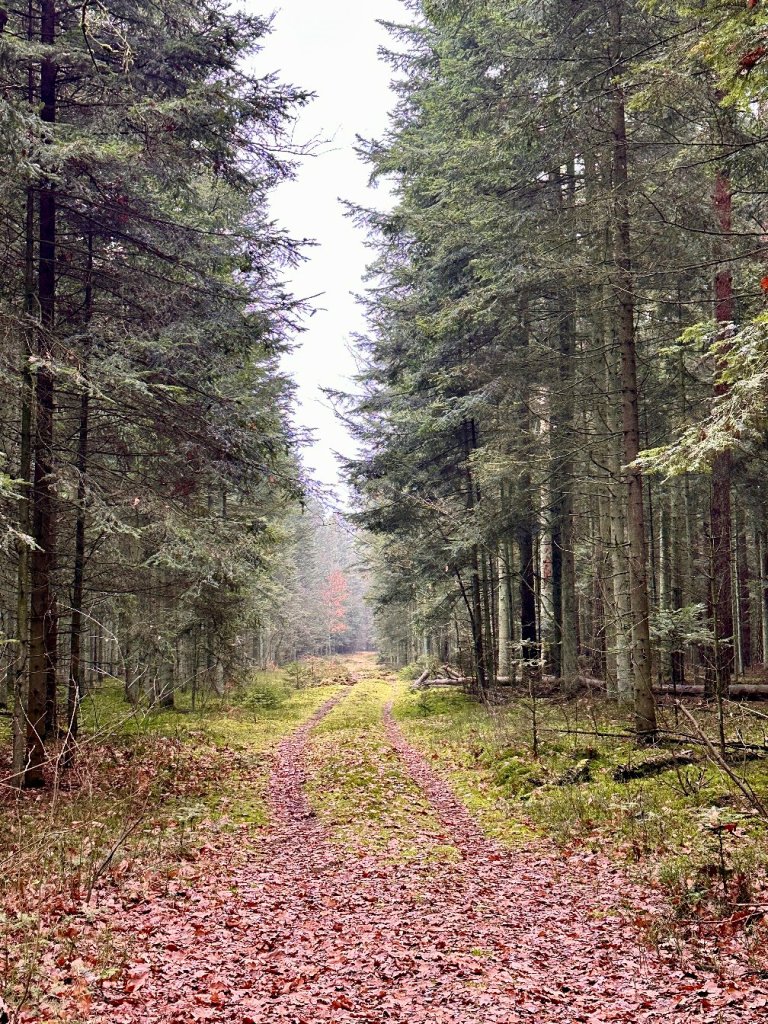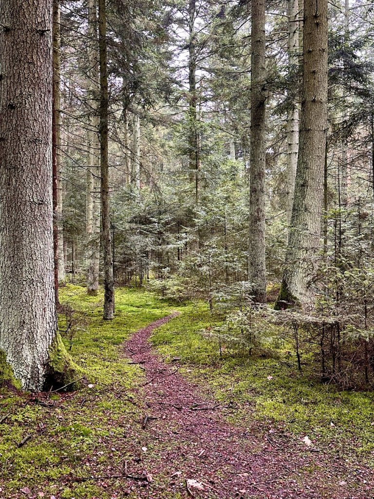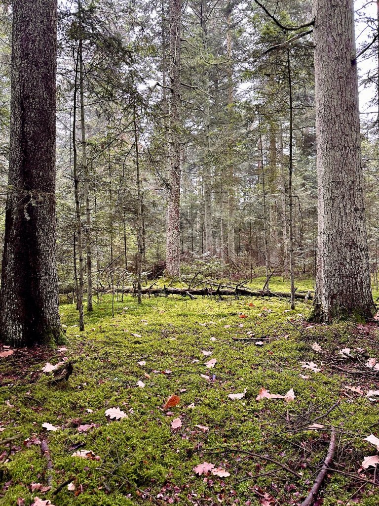 Las robi się ciemniejszy, bardziej iglasty. Mech zaczyna dominować. Taki intensywnie zielony, miękki jak dywan. Pod nogami prawie nie ma liści, tylko brązowa, wilgotna droga i szerokie pasy mchu.