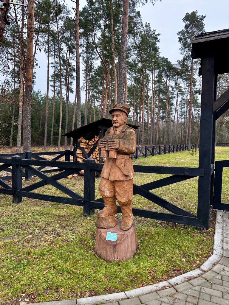 Wchodzimy w cichy, wilgotny las. Po prawej mijamy Centrum Promocji Drewna, dalej teren „Ostoi” z drewnianymi figurami i wiatą piknikową. Na jednej z tabliczek — historia partyzantów. Wszystko lekko zatopione w szarej mgle.