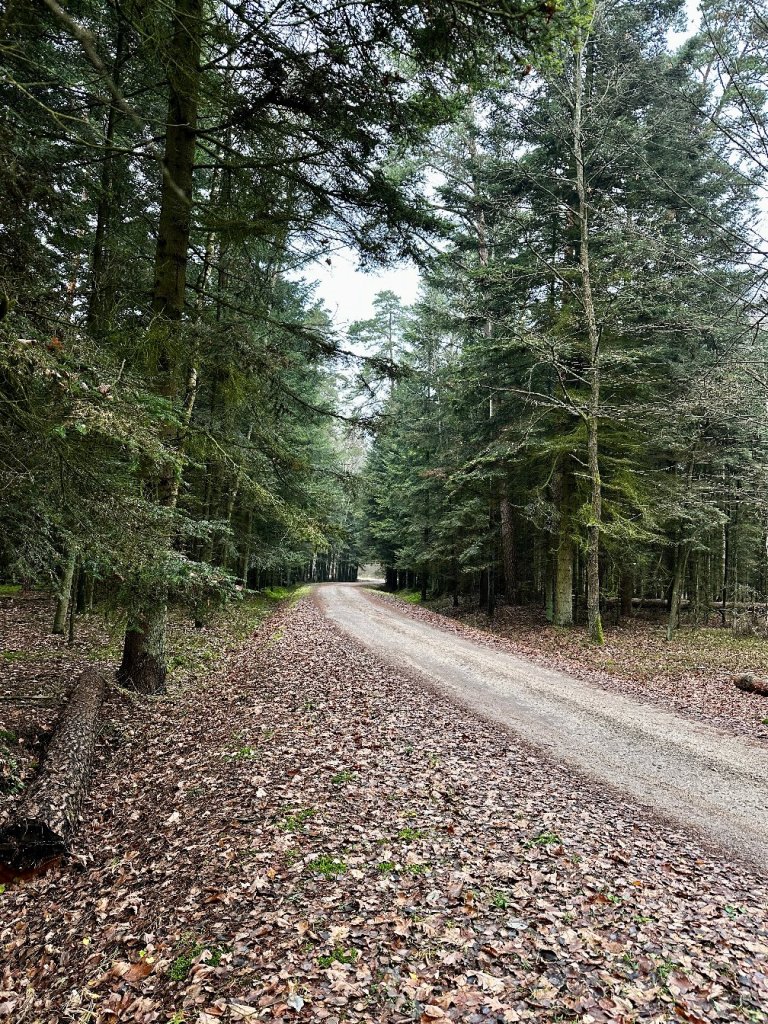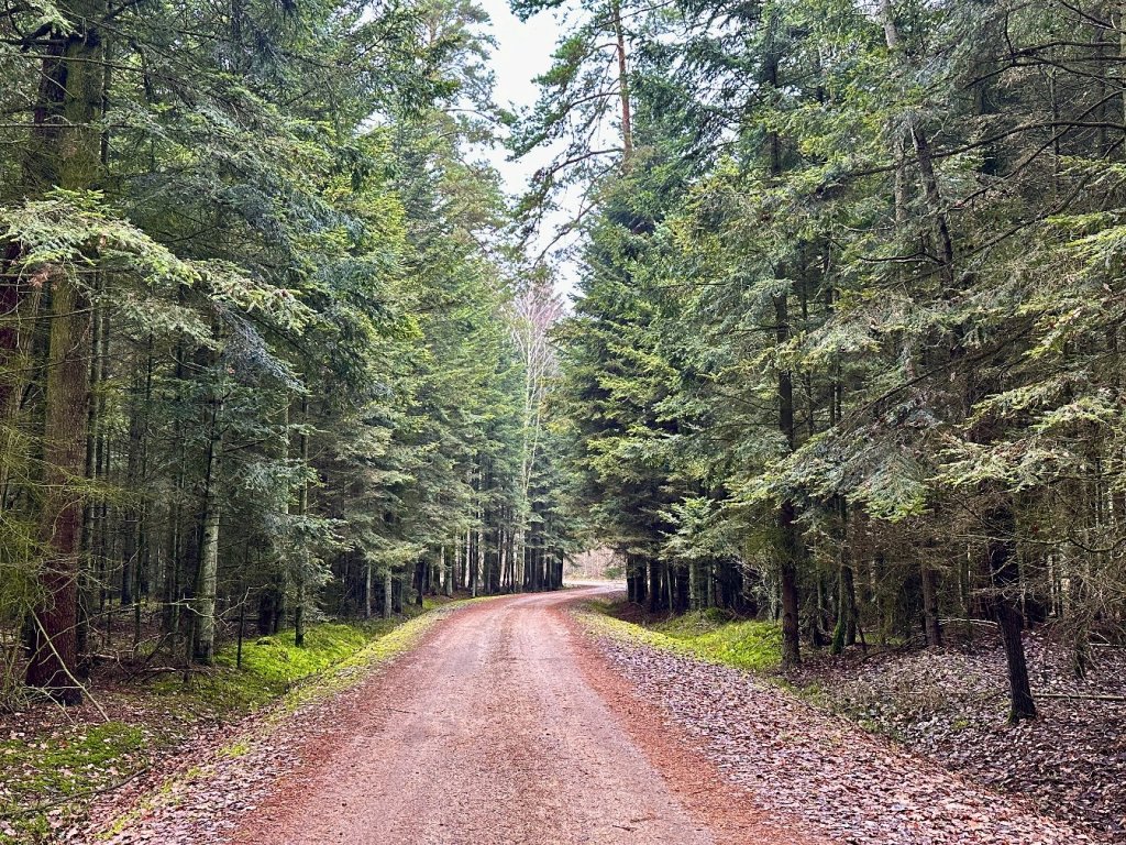 Ścieżka skręca w inny typ lasu. Mniej mchu, bardziej sucho, trochę monotonnie, szerka droga pożarowa, prosty odcinek, mgła w oddali.