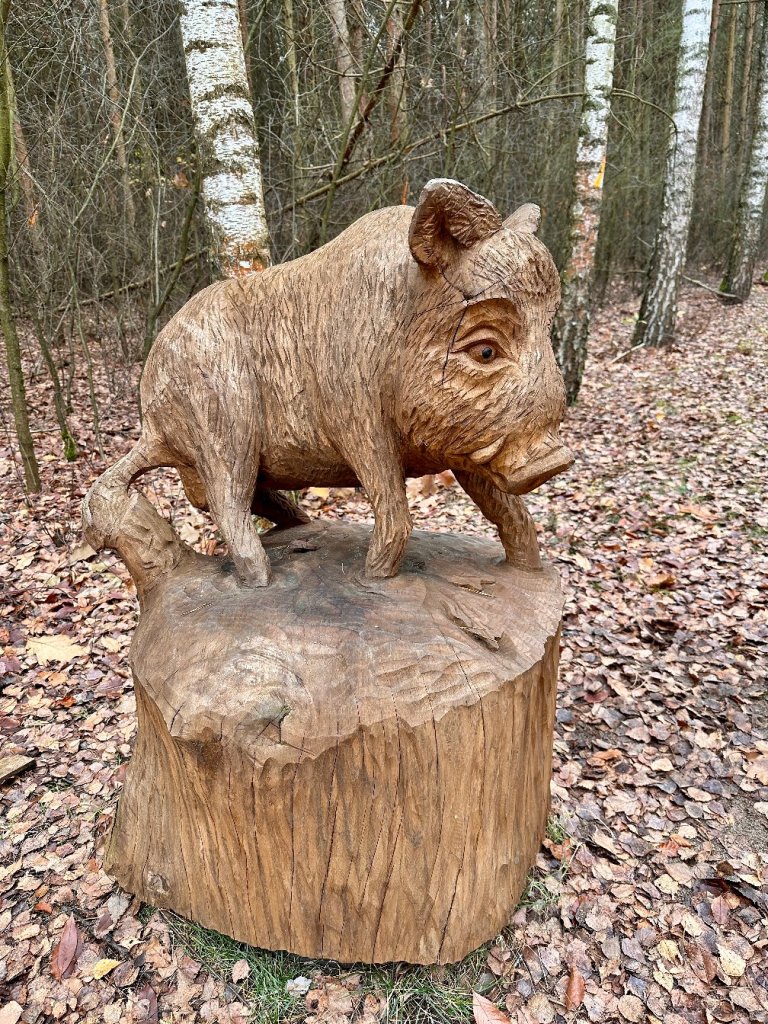 Leśna, prosta droga wśród sosen i brzóz wprowadza nas głębiej. Po drodze mijamy drewniane figurki zwierząt.
