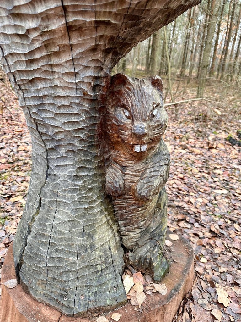 Przyglądamy się wyrzeźbionemu lisowi, wilkowi, sowie, bobrowi, orłowi, który upolował węża. Skojarzyły nam się od razu z figurkami w Bruśnie (link).