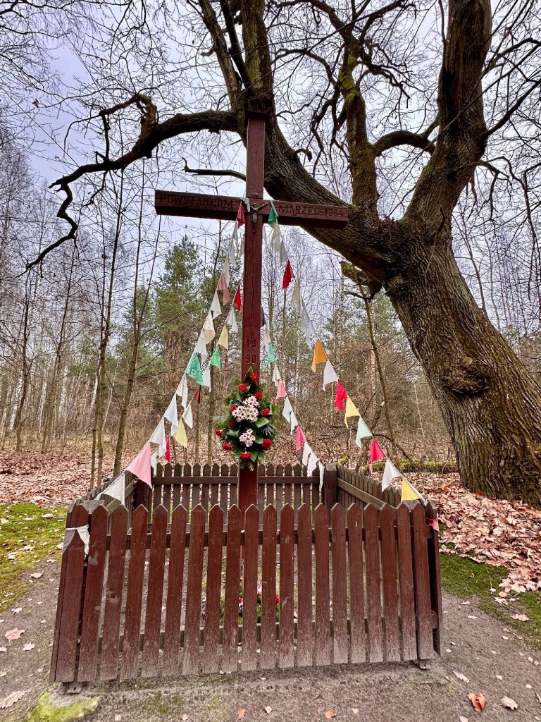 To fragment trasy, który ma w sobie nieco niepokoju. Może to historia walk narodowo – wyzwoleńczych, może świadomość poległych tutaj ludzi i rozegranych bitew sprawia, że pojawia się w nas pewne spięcie, a nawet czujność. Idziemy powoli rozglądając się po lesie, co chwila przystajemy spoglądając na duże, rozłożyste dęby. Wyglądają dosyć nietypowo. Miejsce zdecydowanie wzbudza w nas emocje.