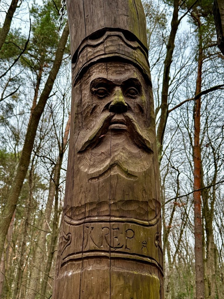 Wchodzimy przez drewnianą bramę na ścieżkę. Na słupach są rzeźbione twarze kobiety Anki i mężczyzny Krępa, bohaterów lokalnej legendy.