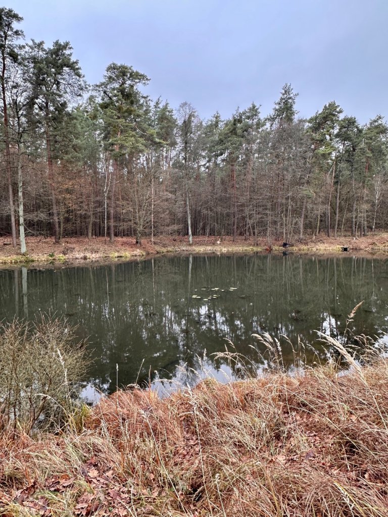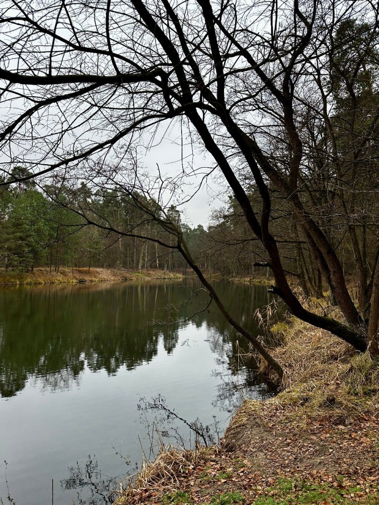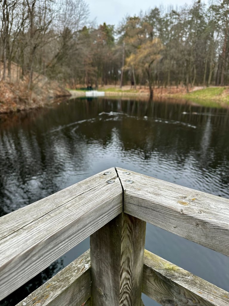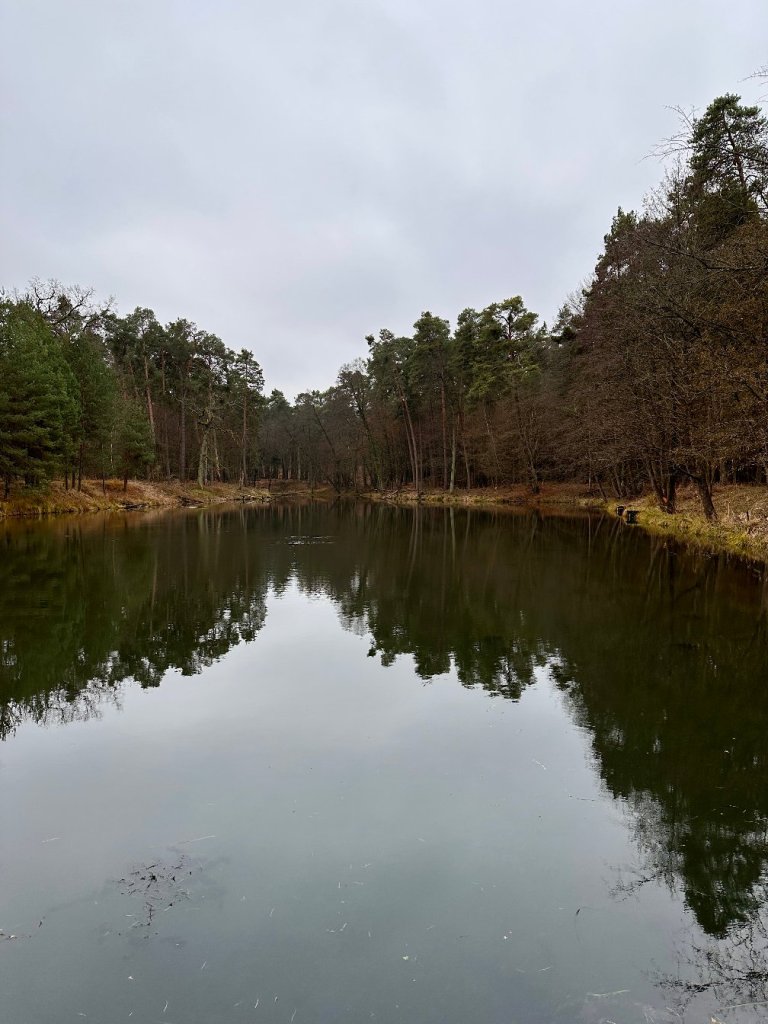 Wychodzimy z lasu i docieramy do niewielkiego stawu. Odbijają się w nim drzewa i ciężkie, pochmurne niebo. Stoją tu wędkarze, a szum wody dodaje temu miejscu innego klimatu. Jest spokojnie i cicho.