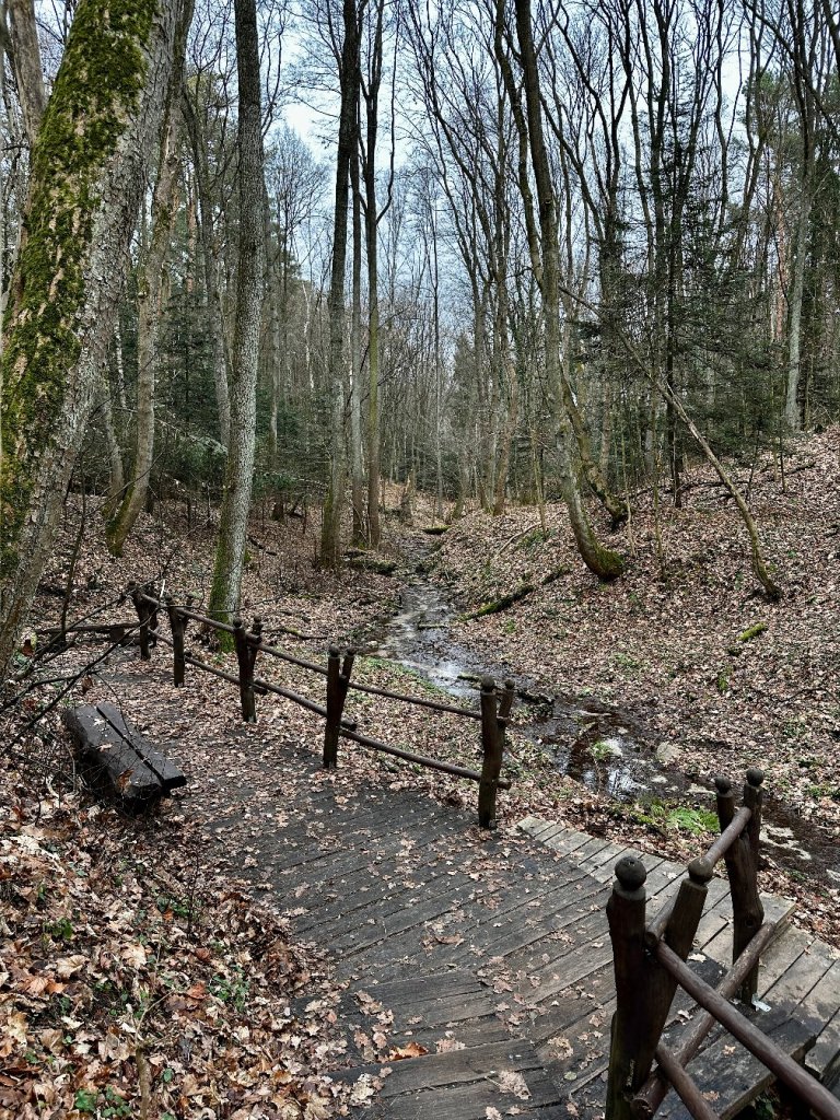Drewniane schodki prowadzą nas do samego źródełka. Woda szumi delikatnie, choć w grudniu miejsce jest szare i stonowane. Latem musi tu być wyjątkowo uroczo. Są ławki i barierki odgradzające od strumienia, dzięki czemu można spokojnie przysiąść i popatrzeć na przyrodę. Dzisiaj jednak nie decydujemy się na dłuższy pobyt. Wracamy tą samą drogą, wspinając się po schodach.