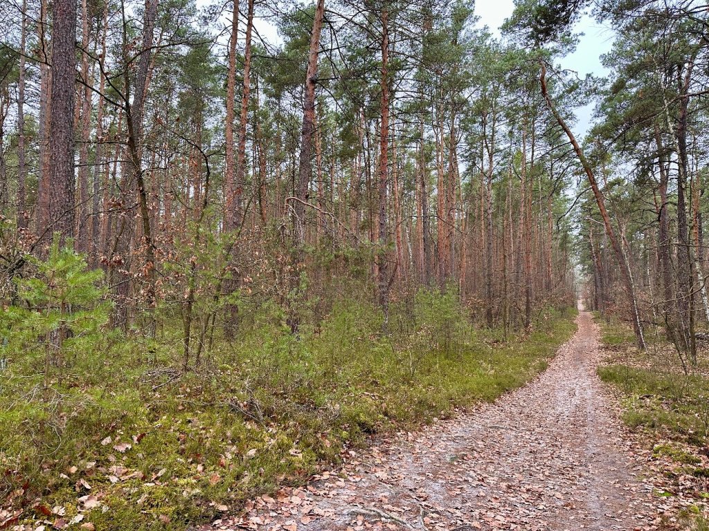 Wracamy na główną drogę, szeroką, piaszczystą. Po prawej towarzyszy nam ledwo widoczny nasyp kolejowy. Miejscami ślady po dawnym torowisku są bardziej widoczne. Mijają nas kolejni spacerowicze. Dalej przechodzimy przez teren po wycince drzew, nieco surowszy, smutniejszy.