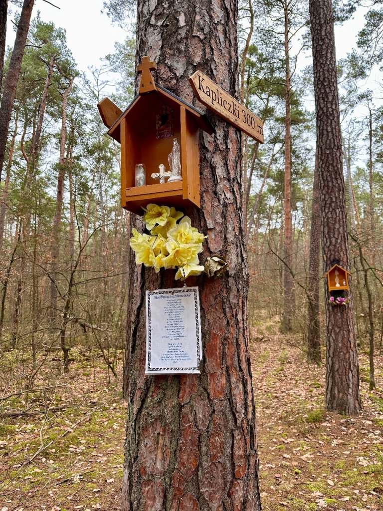Dostrzegamy dwie kapliczki na drzewie wraz z modlitwą i znaczkiem, kierującym do kolejnych kapliczek. Skręcamy w boczną ścieżkę by je zobaczyć.