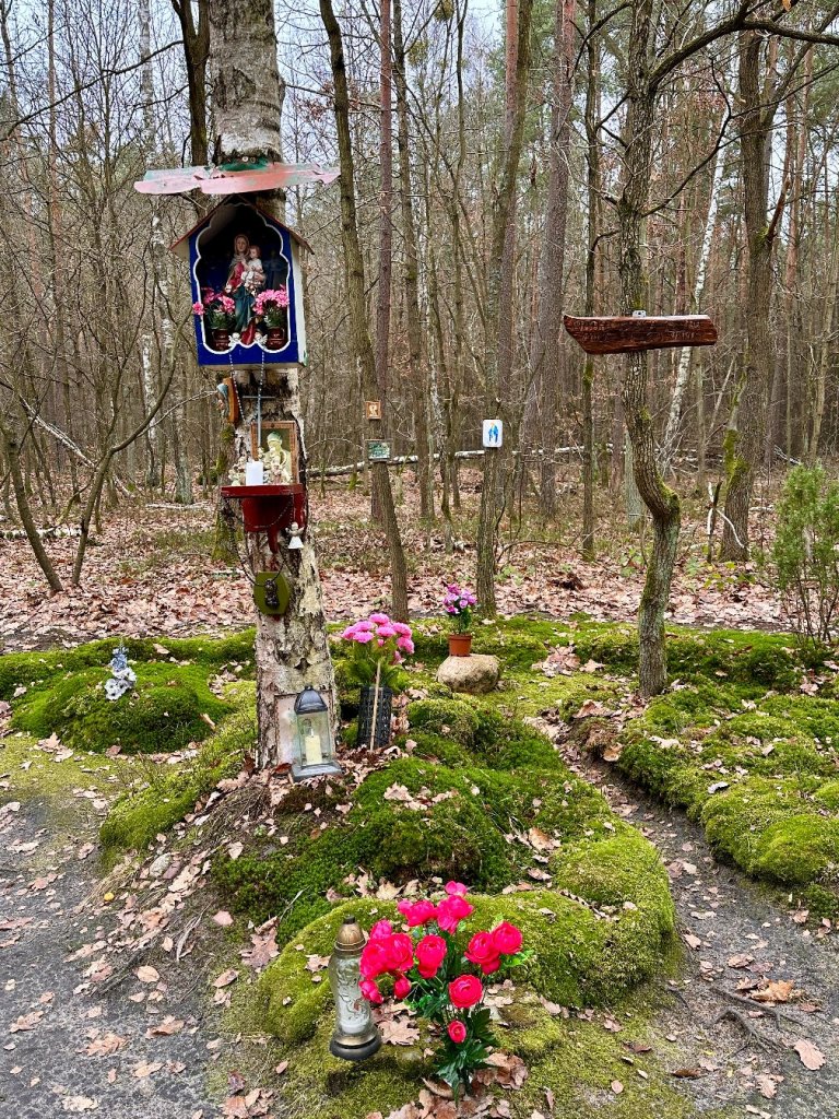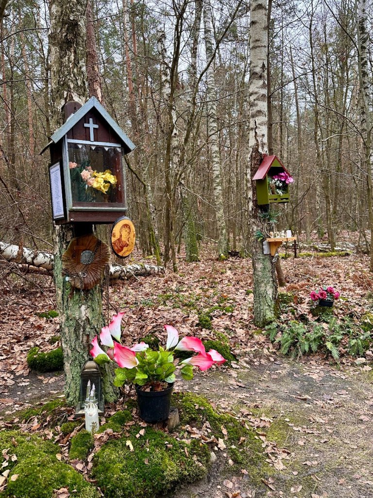 Przed nami, pomiędzy drzewami wyłania się specyficzny obraz. Jest niesamowicie kolorowo. Na drzewach znajdują się różnorodne kapliczki, z modlitwami przypiętymi do kory, z kolorowymi kwiatami, z wizerunkami Matki Boskiej i Jana Pawła II, krzyżami, ozdobione w rozmaity sposób. Spacerujemy między nimi, dostrzegamy maleńkie ławeczki i pieńki do siedzenia. Wszystko to wygląda niezwykłe w środku lasu, jak małe sanktuarium wśród drzew.