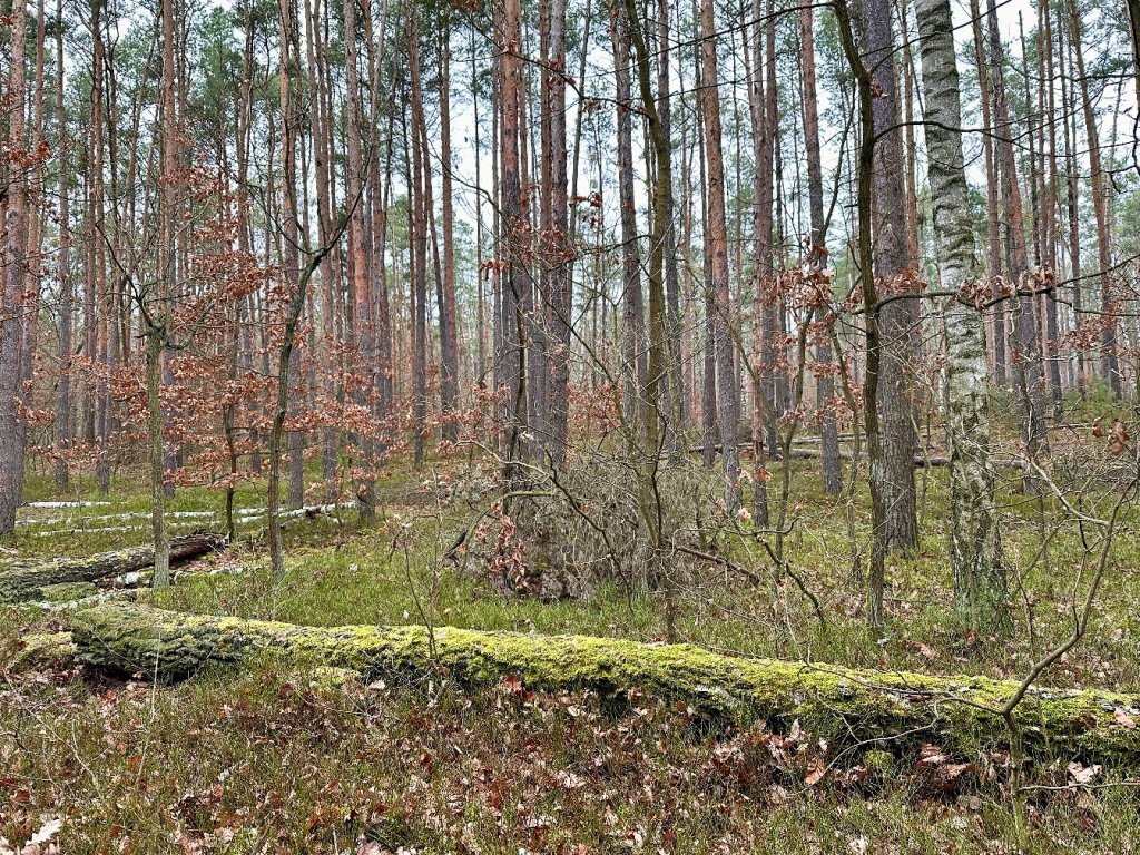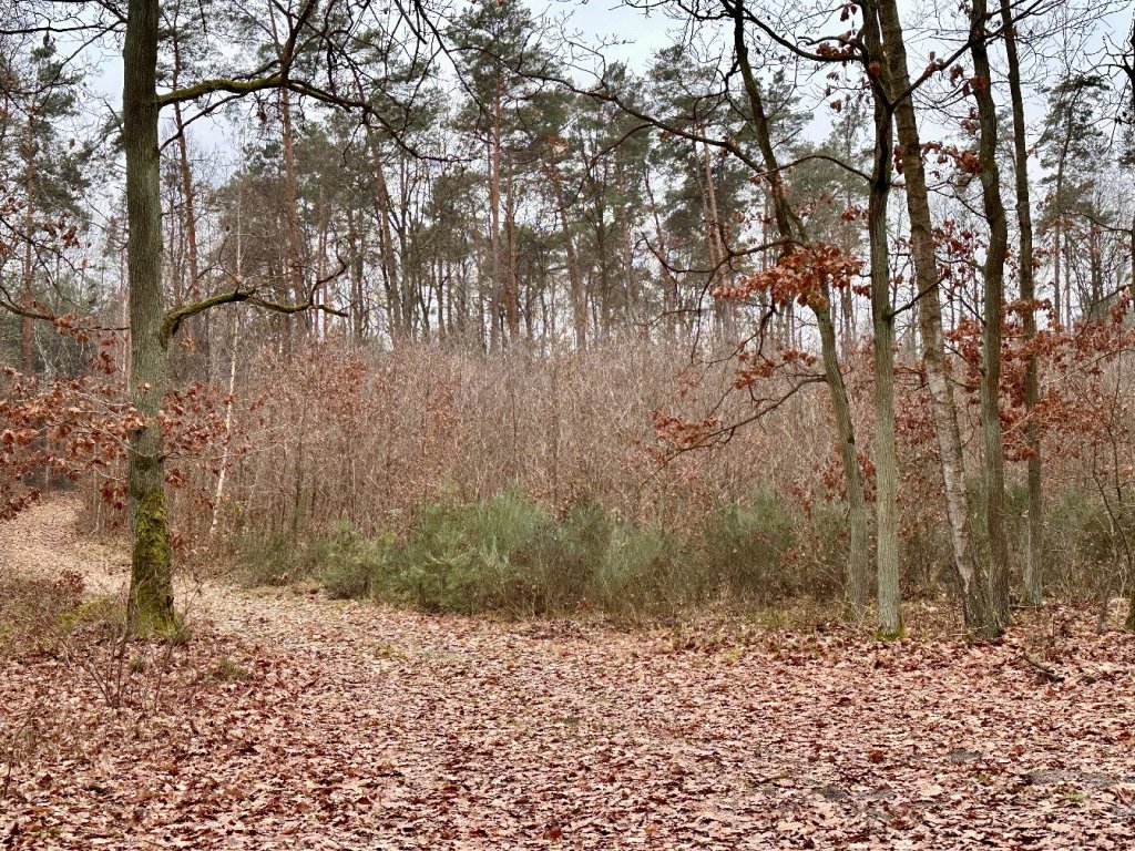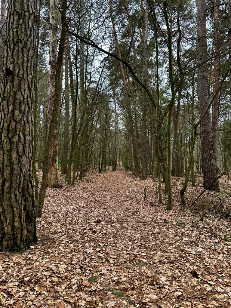 Ścieżka skręca, las robi się ciemniejszy i bardziej gęsty. Przecinamy drogę pożarową. Dostrzegamy, że miejscami ściółka jest nadal zielona od krzewów i niskich roślin, które utrzymują kolor mimo zimy.
