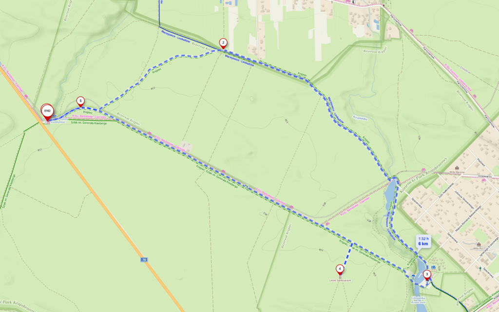 Trasa: Parking – Po wyjściu z parkingu przechodzimy przez drewnianą barwę z napisem “Krępiec” – Schodzimy schodami na dół – Źródełko – Wracamy schodami na górę i skręcamy w lewo – Na skrzyżowaniu wybieramy drogę w lewo – Podążamy zielonym szlakiem przez las – Mijamy krzyż upamiętniający powstańców styczniowych przy którym skręcamy w prawo dalej kierując się szlakiem zielonym – Dochodzimy do stawu który obchodzimy z lewej strony – Przy drugim stawie, na końcu plaży jest mostek, którym należy przejść na drugą stronę – Wchodzimy po wydmie na górę – Kierujemy się dalej cały czas prosto szlakiem zielonym – Skręcamy w lewo przy znaku kierującym do kapliczki – Kapliczka – Wracamy do skrzyżowania i skręcamy w lewo – Idziemy cały czas prosto i za około 2,5 km wrócimy do miejsca w którym zaczynała się ścieżka – Parking
