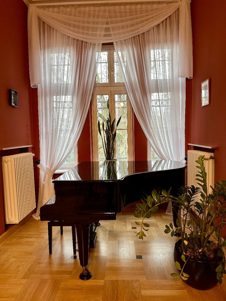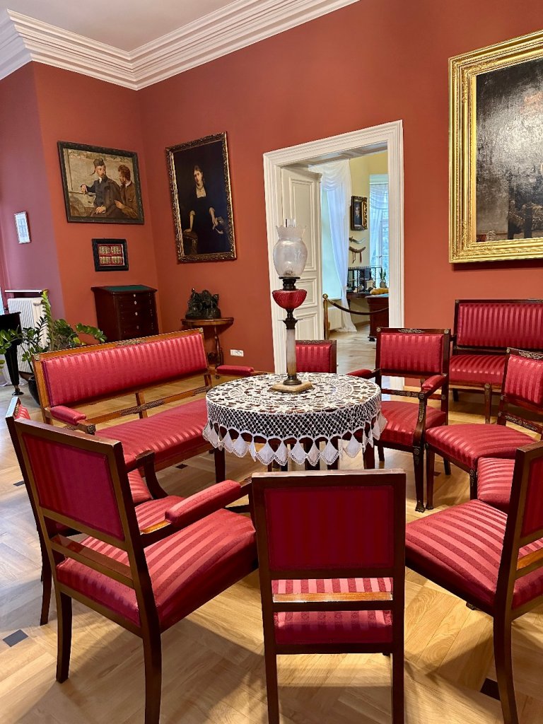 Salon ma ciemnoróżowe ściany i mnóstwo portretów. Krzesła ustawione są w krąg wokół stolika, co tworzy bardzo „rozmowną” przestrzeń. Stojący pod oknem fortepian nadaje wnętrzu elegancji.