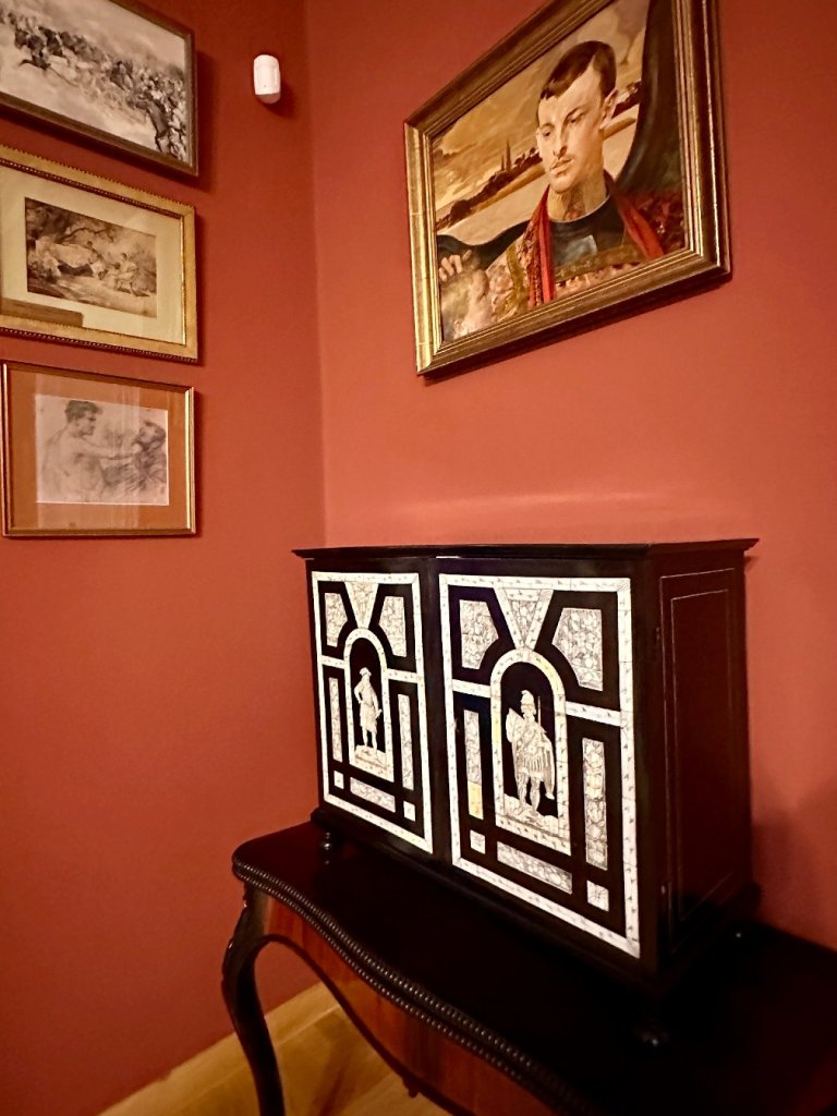 Jest też ciemny, masywny kredens z porcelaną, stół z krzesłami o bardzo ciekawie rozwiązanych nóżkach oraz kolejne obrazy i zdjęcia.