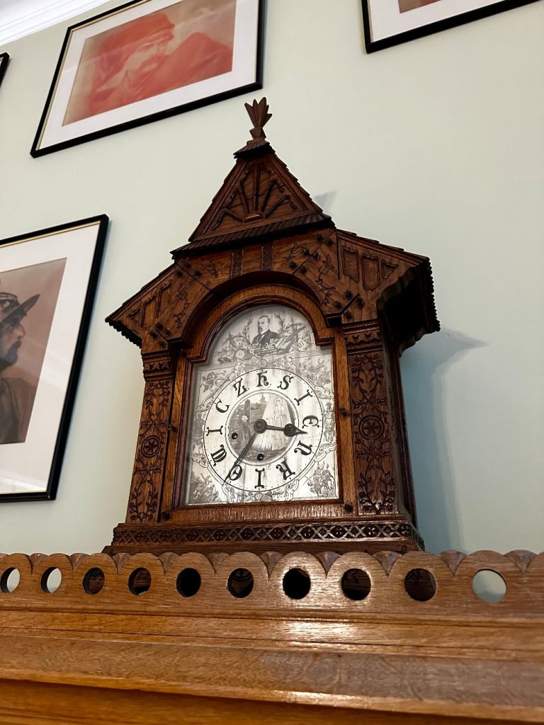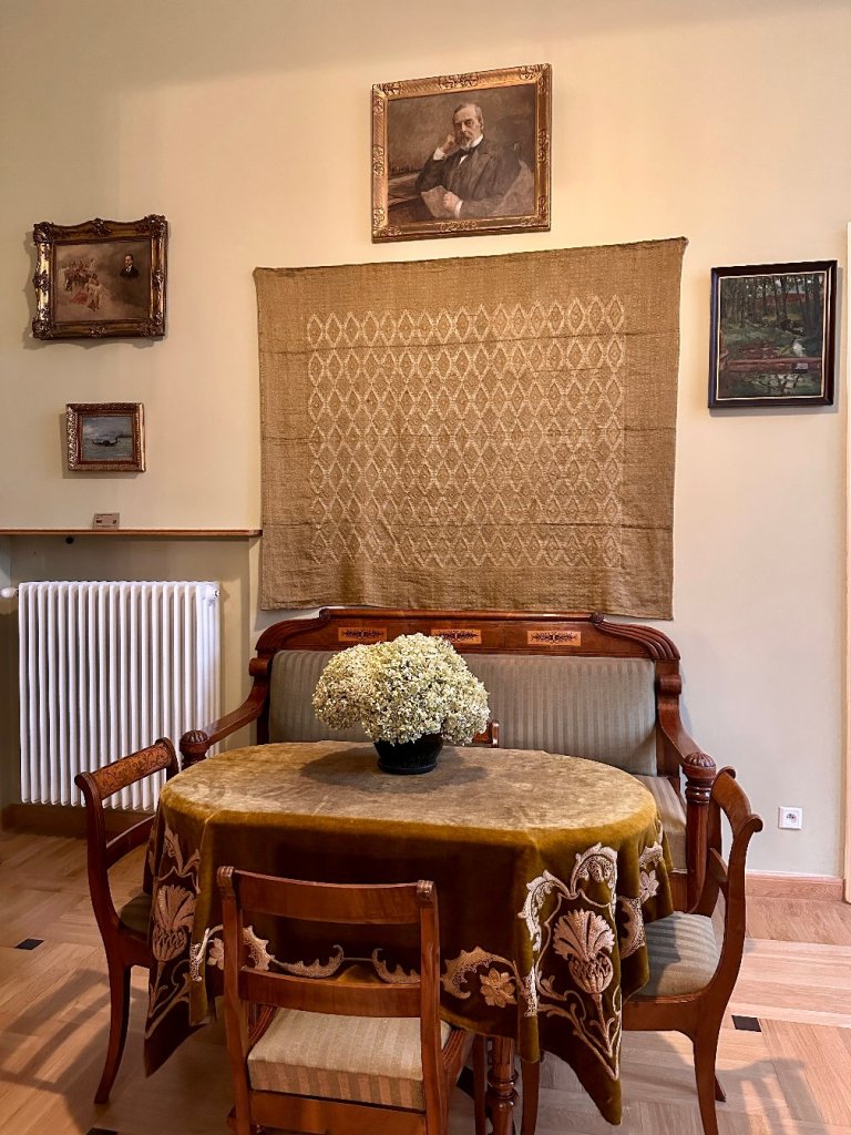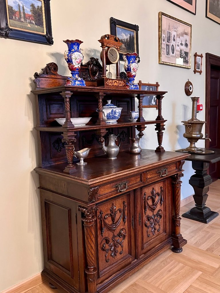 W jadalni stoją dwie ogromne drewniane szafy, jedna z metalowymi okuciami. Na niej jest zegar, prezent dla pisarza, z tarczą, na której zamiast cyfr widnieją litery składające się w napis „H Sienkiewicz„. Żartujemy, że zawsze jest czas na Sienkiewicza.