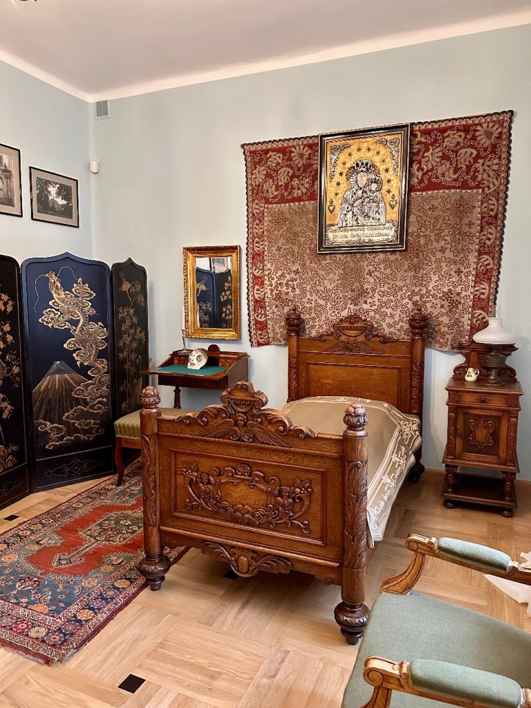 Sypialnia jest zaskakująco skromna. Komoda, niewielki mebelek z szufladkami, a na stoliku nocnym zegarek wkomponowany w muszlę perłowca. Łóżko wydaje się małe, niemal dziecięce. Na ścianach wiszą kolejne obrazy, chociaż nie mamy już cierpliwości do ich podziwiania.