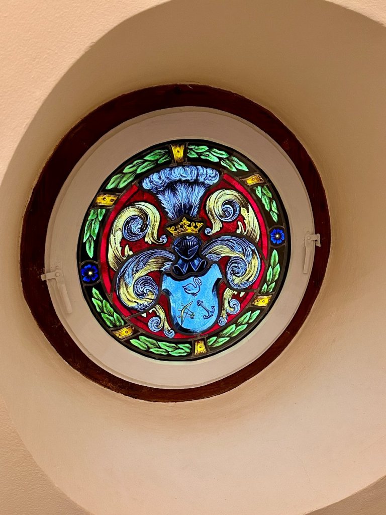 Schodami wchodzimy na górę. Na klatce schodowej wiszą obrazy przedstawiające zamki, a poniżej nich dostrzegamy piękny, kolisty witraż.