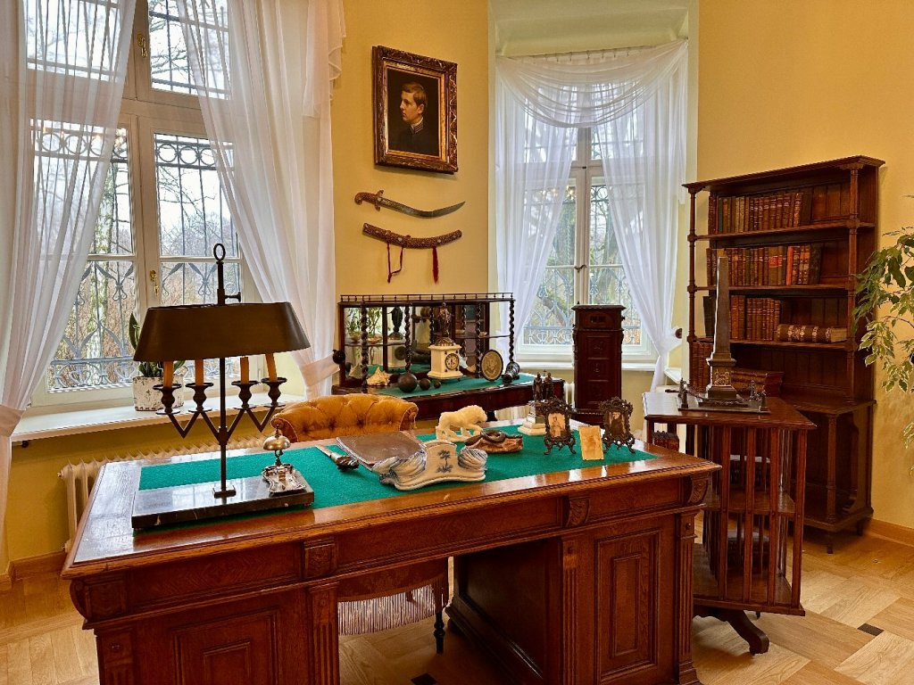 Trasa: Zwiedzanie zaczynamy od parteru i kierując się w prawo przechodzimy przez kolejne pomieszczenia: gabinet, salon, palarnię, sypialnię i jadalnię. Następnie przechodzimy na piętro gdzie dostępne są wystawy czasowe.