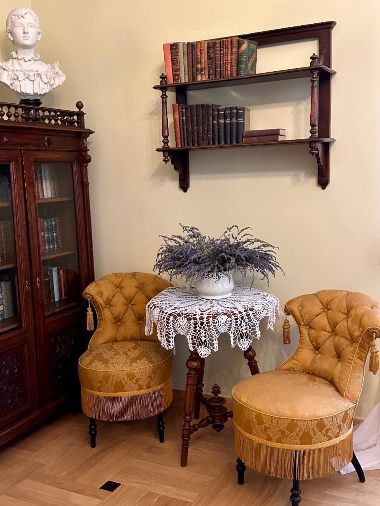 Gabinet to jedno z tych pomieszczeń, w których łatwo zostać na dłużej. Jest eleganckie drewniane biurko, fantazyjne krzesła i pasująca do nich kanapa w żółtawo-brązowym odcieniu.
