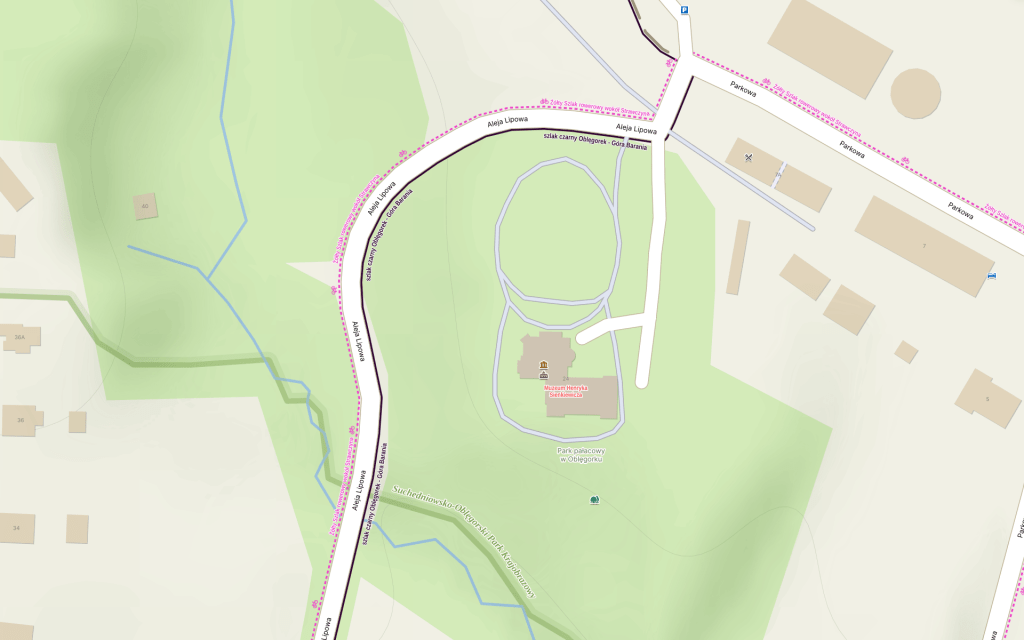 - Parking za muzeum – bezpłatny, nieduży parking na kilka samochodów. Można na niego wjechać z ulicy Parkowej. Należy minąć szkołę jeździecką i skręcić w lewo. Miejsce parkingowe znajduje się tuż obok bistro.