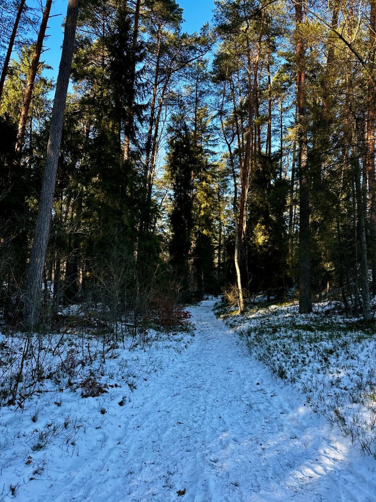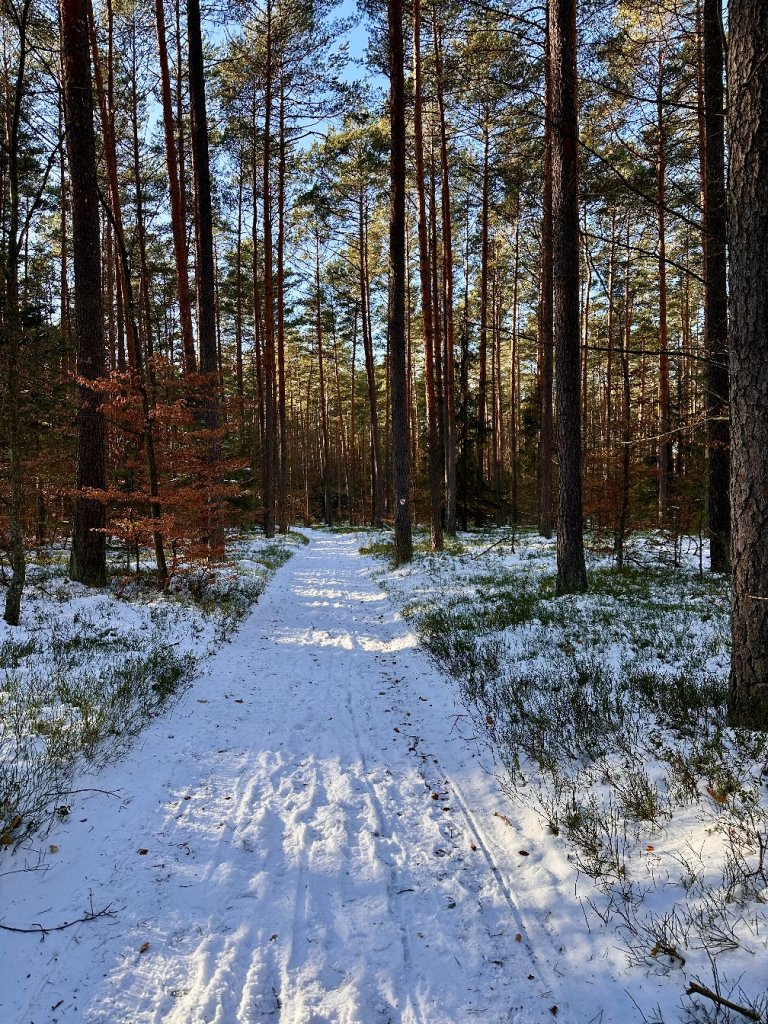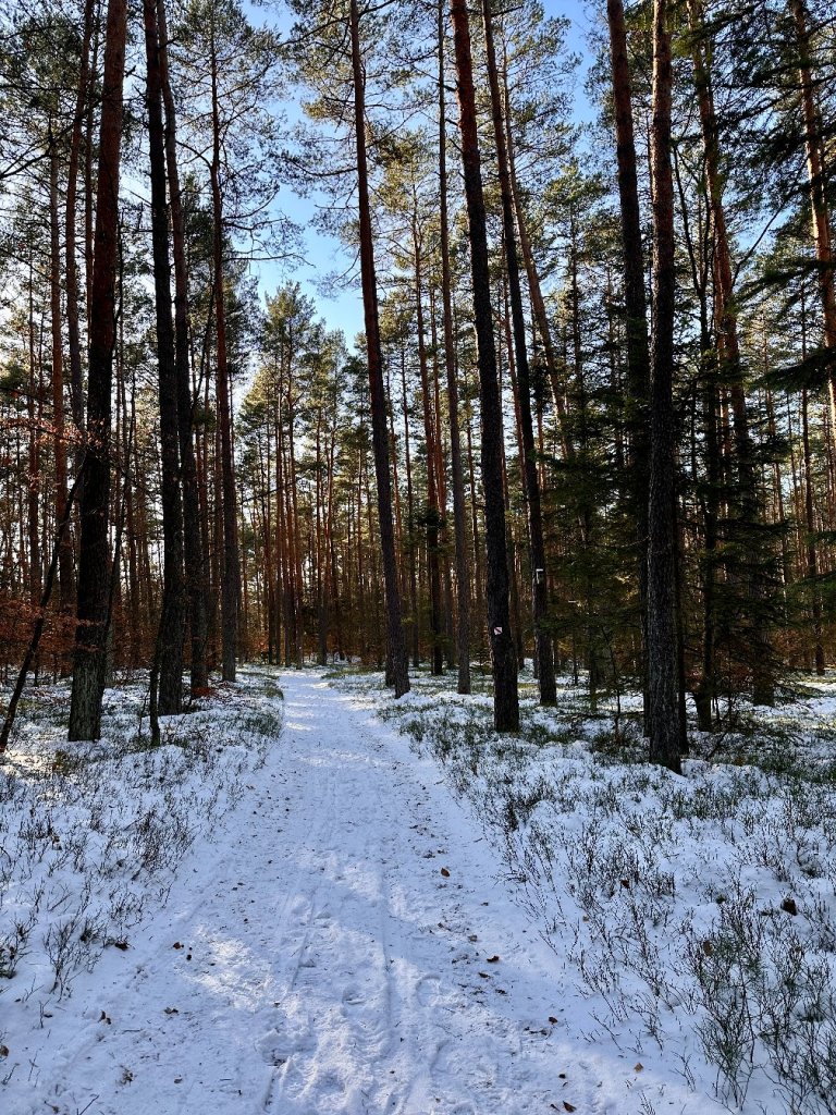 Nie spotykamy tu nikogo. Idziemy szeroką leśną drogą, a słońce przedziera się między pniami drzew tworząc na śniegu charakterystyczne, iskrzące linie.