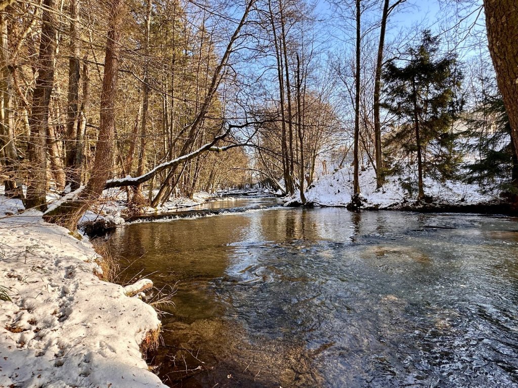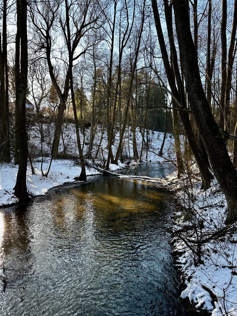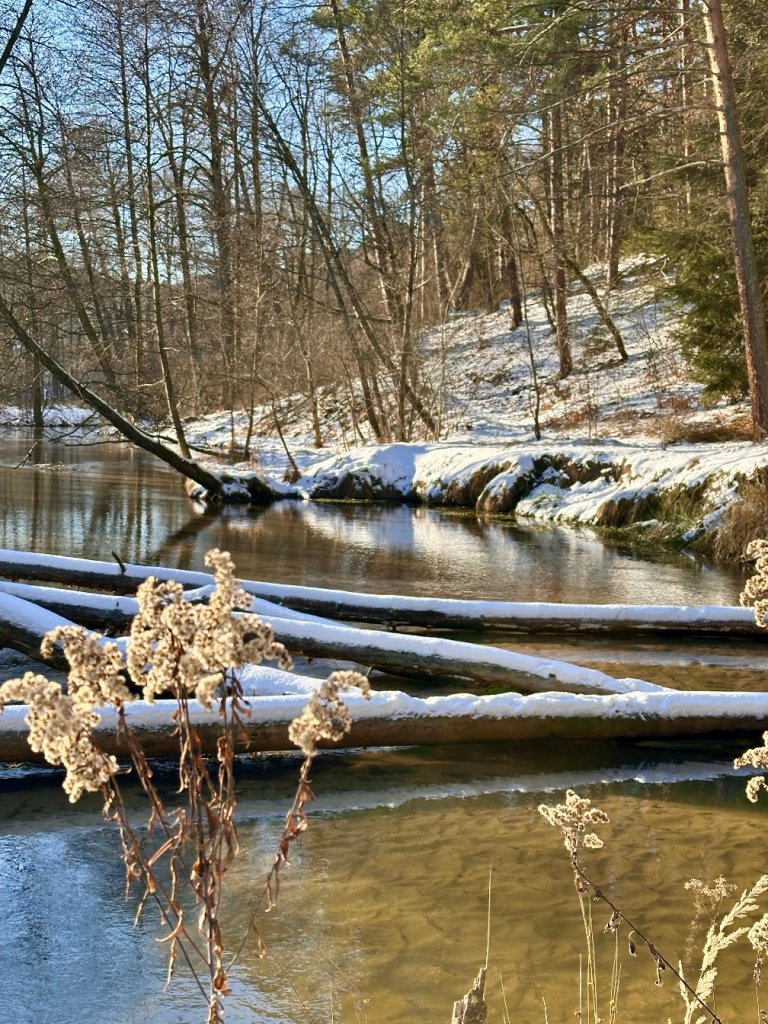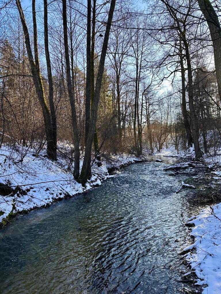 Zielone drzewa kontrastują ze śniegiem. Biel iskrzy tak mocno, że aż mrużymy oczy. Mijamy rzekę, obserwując jej zakręty. Wiatr szumi, a woda jest przejrzysta, spokojna, lekko falująca.