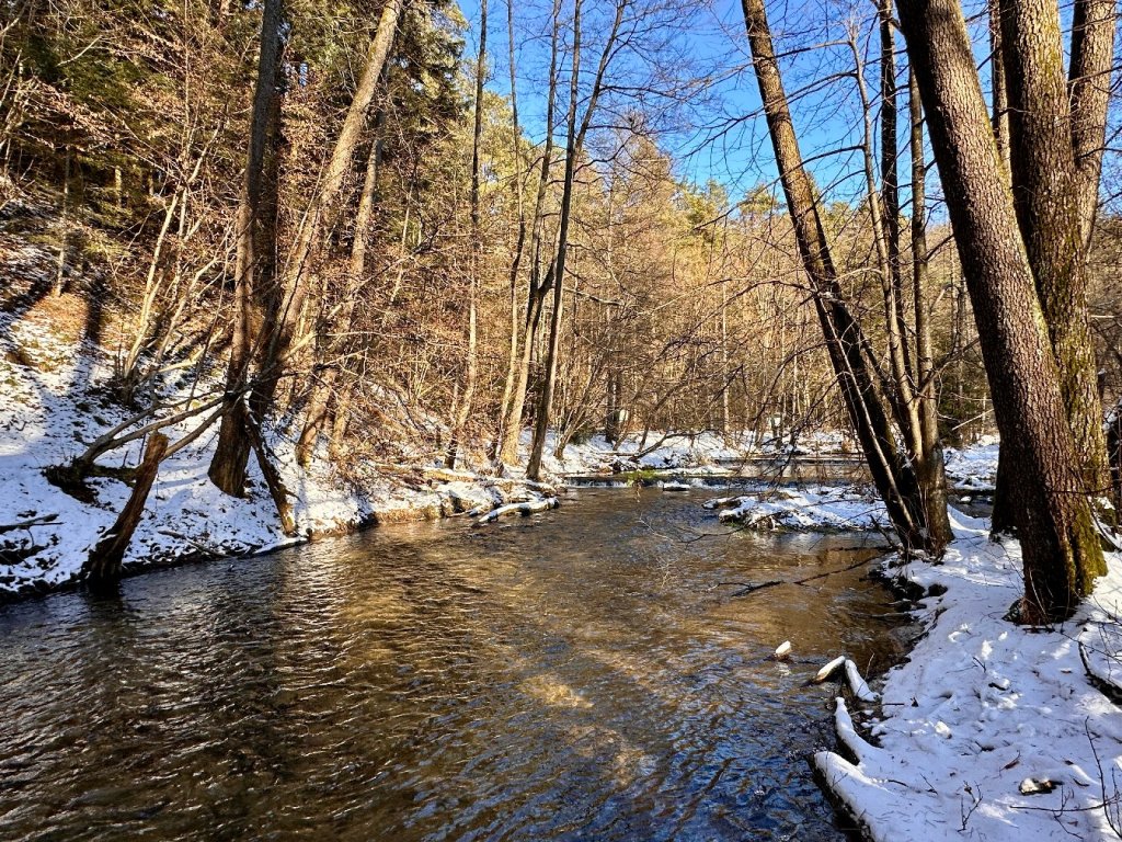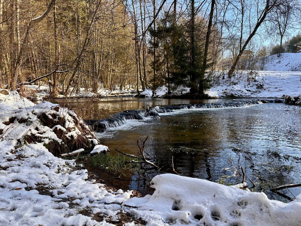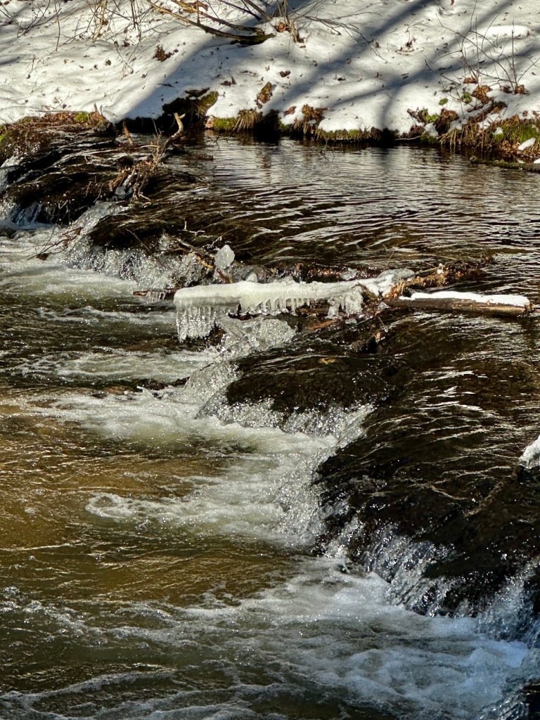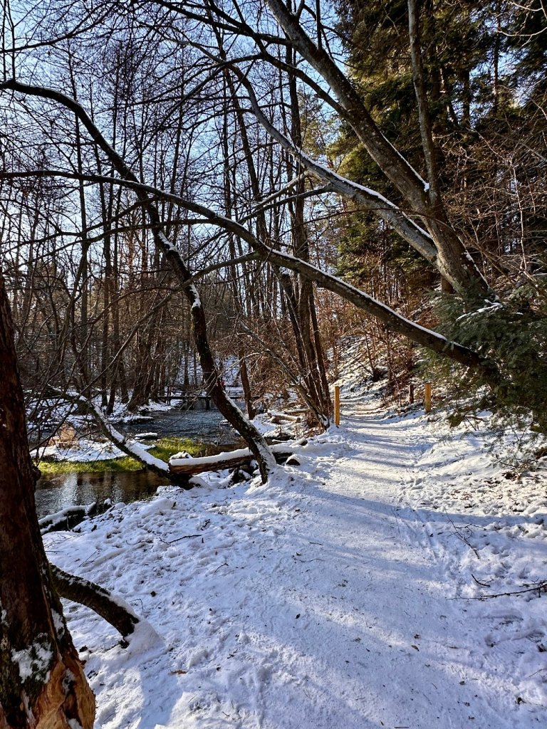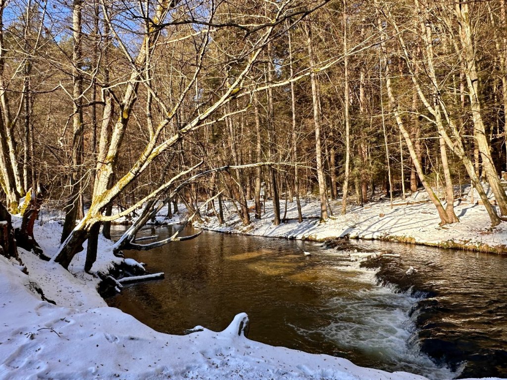 Zielone drzewa kontrastują ze śniegiem. Biel iskrzy tak mocno, że aż mrużymy oczy. Mijamy rzekę, obserwując jej zakręty. Wiatr szumi, a woda jest przejrzysta, spokojna, lekko falująca.