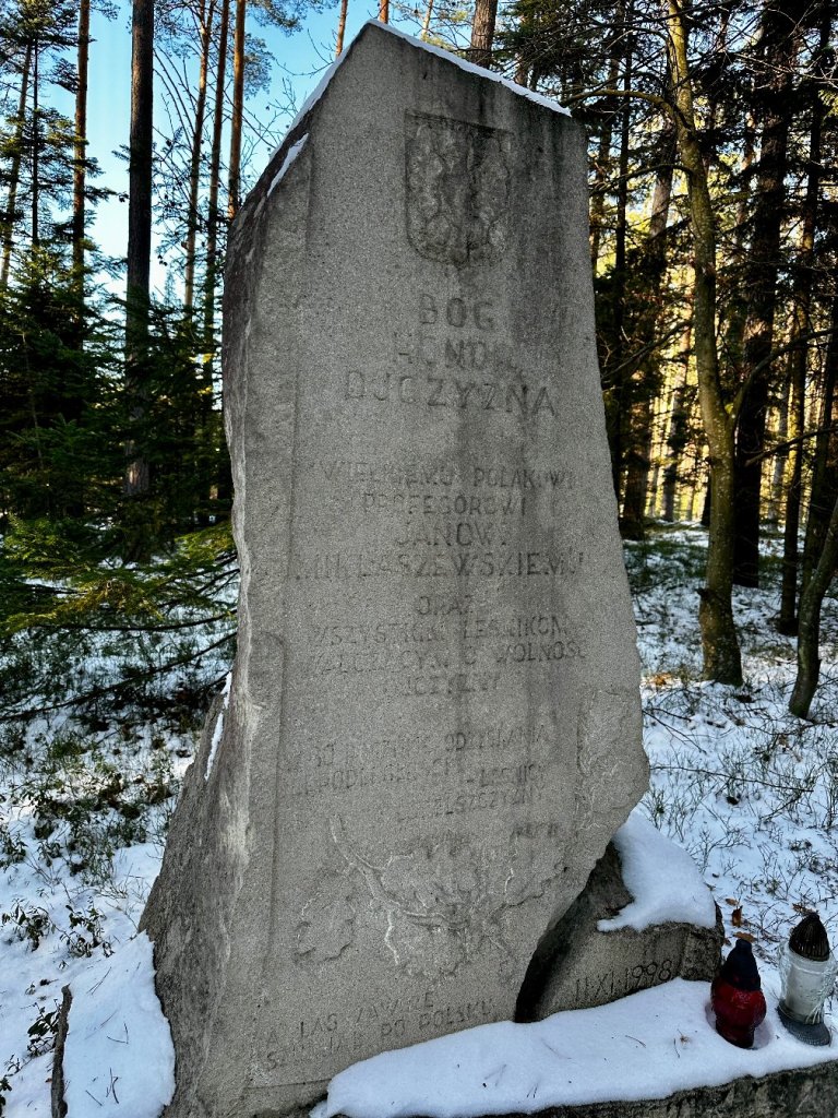 Podchodzimy pod górę, głębiej w las. Na wzniesieniu znajduje się tabliczka i kamienny pomnik z krzyżem, poświęcony leśnikom-patriotom. To miejsce skłania do krótkiego zatrzymania.
