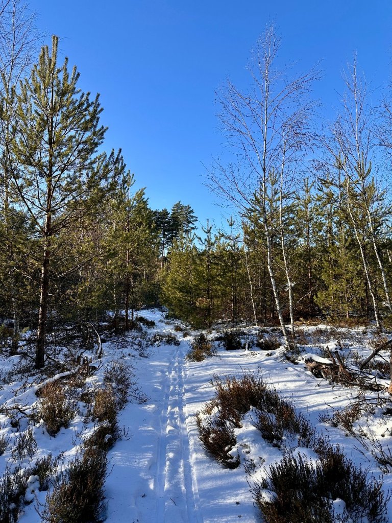 Skręcamy w węższą, mniej wydeptaną drogę. Jest więcej śniegu, spod bieli wystają wrzosy i młode drzewka. Idziemy lekko w dół.