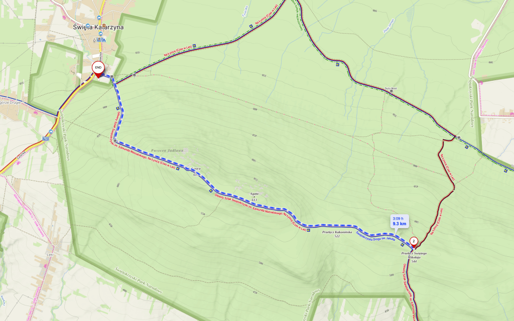 Trasa: Parking – Z parkingu skręcamy w prawo – Kierujemy się oznaczeniami szlaku czerwonego – Łysica szczyt – Idziemy dalej szlakiem czerwonym – Przełęcz Śm. Mikołaja – Wracamy do parkingu tą samą drogą – Parking