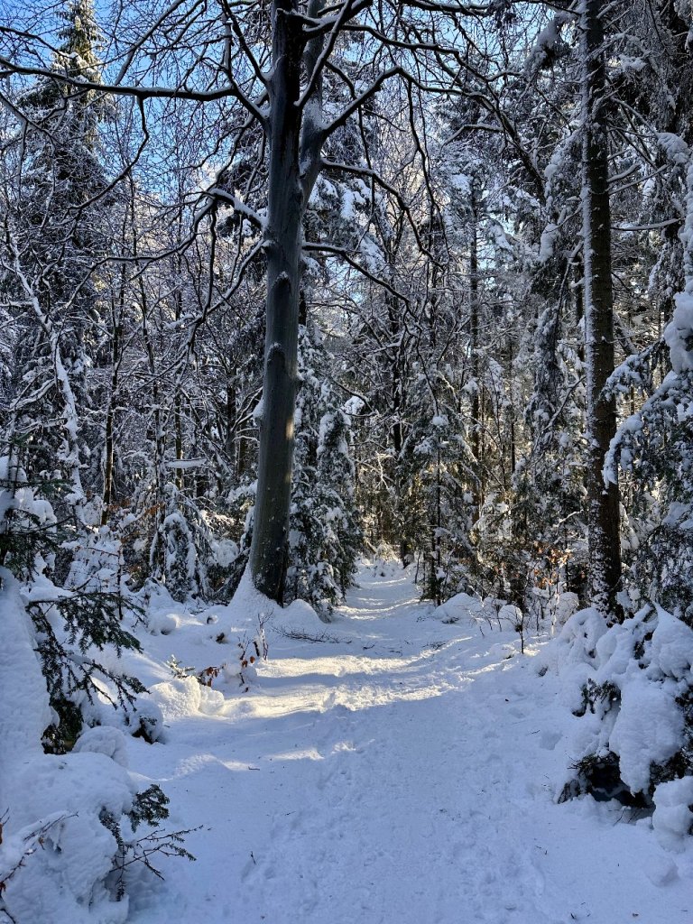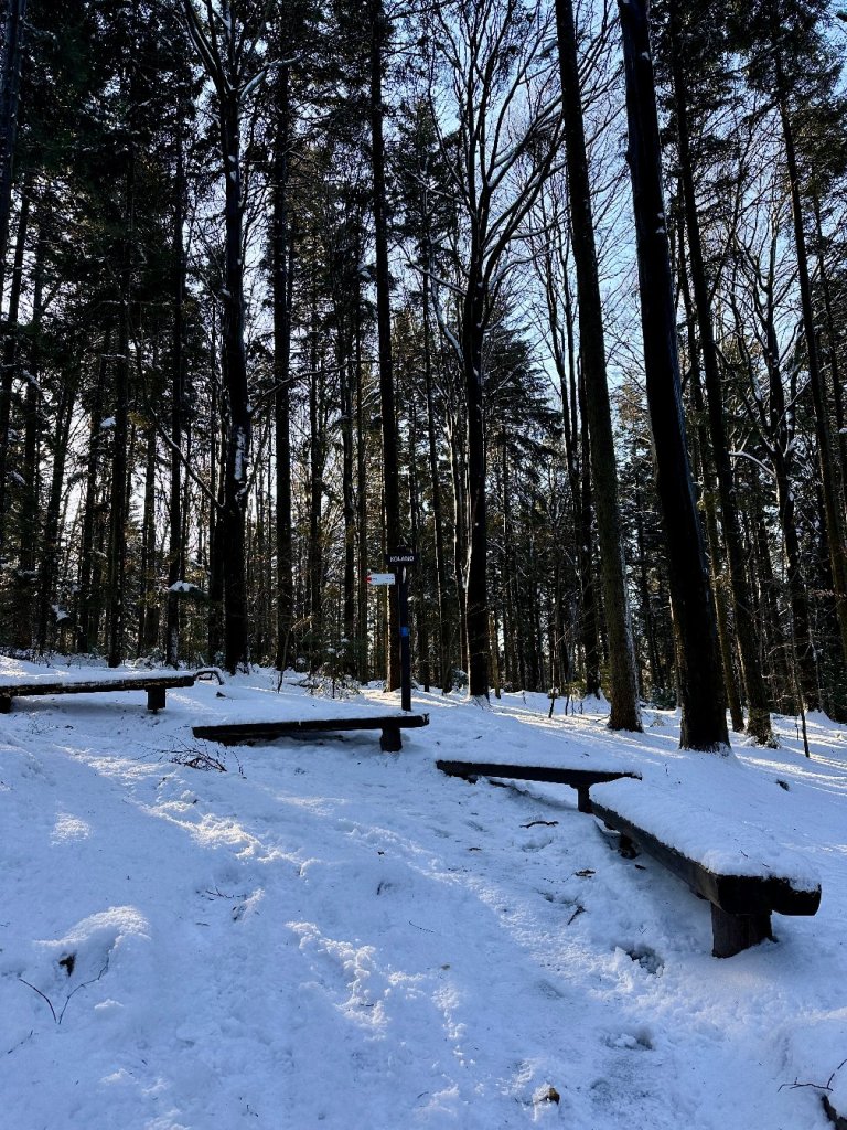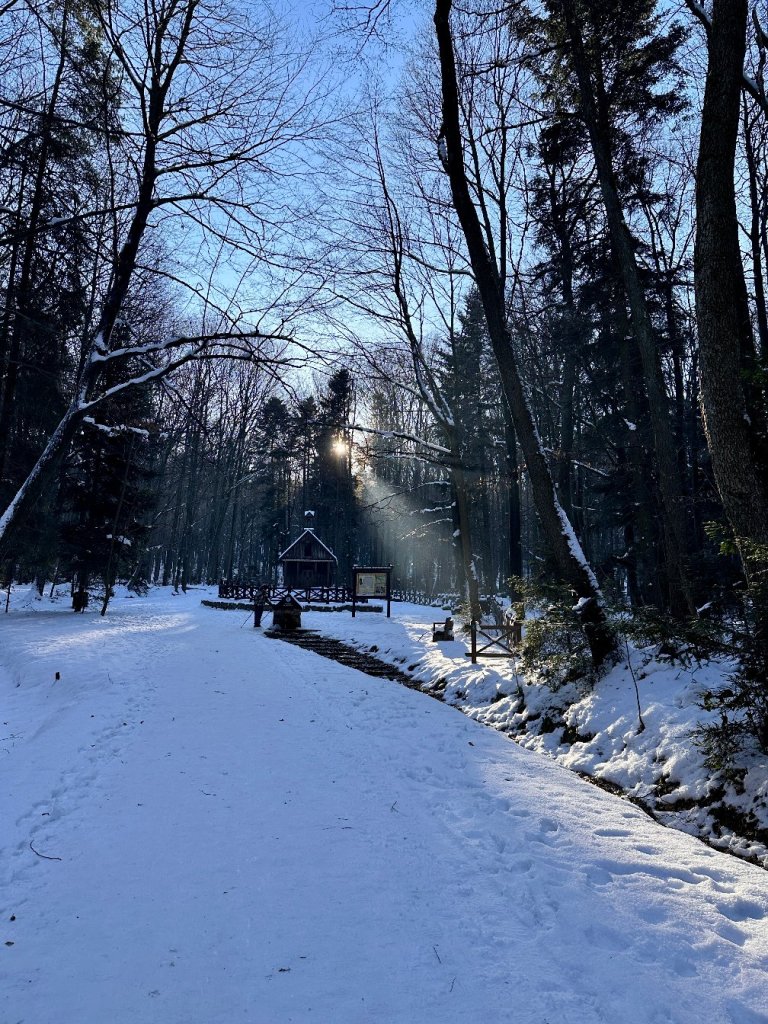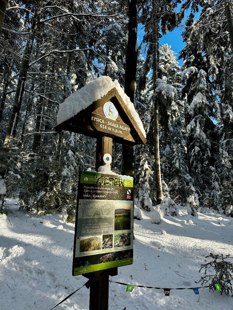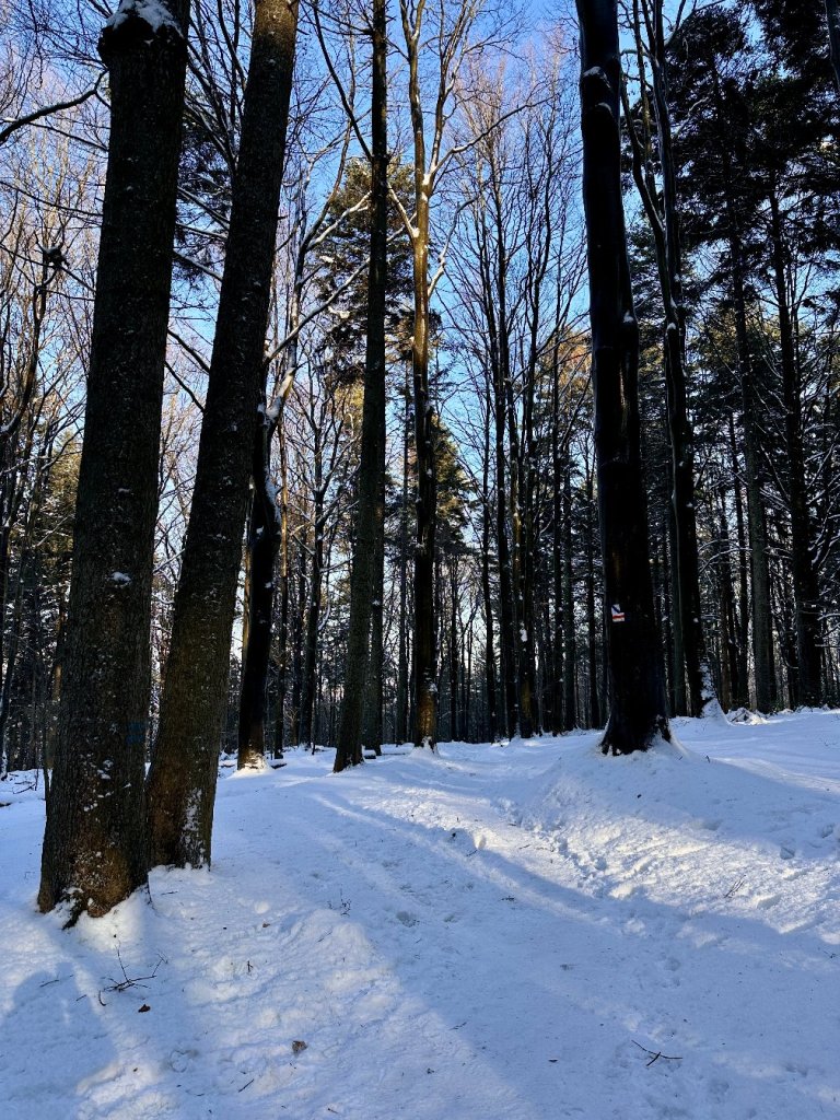 Schodząc ze Skały Agaty, zauważamy zmianę lasu. Mniej śniegu na gałęziach, więcej wysokich drzew liściastych, mniej iglaków. Nadal pięknie, ale inaczej. Szlak się wypłaszcza, robi się spokojniej, ludzi jest już wyraźnie mniej.