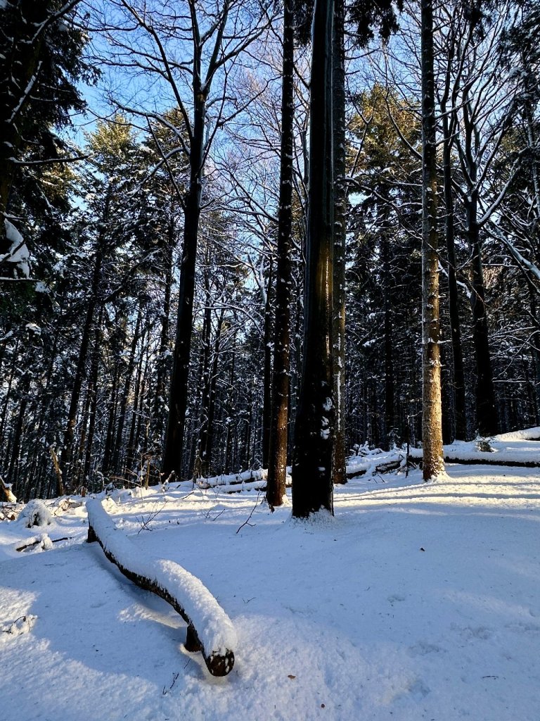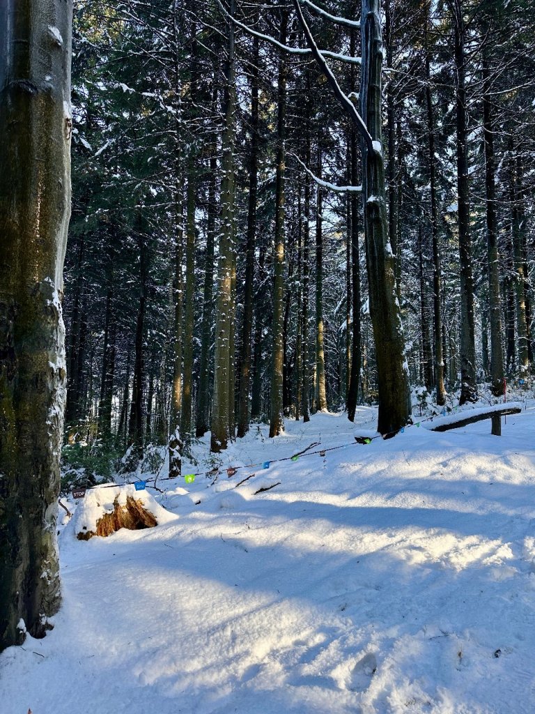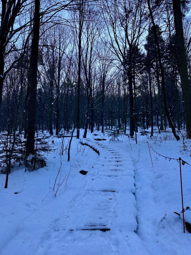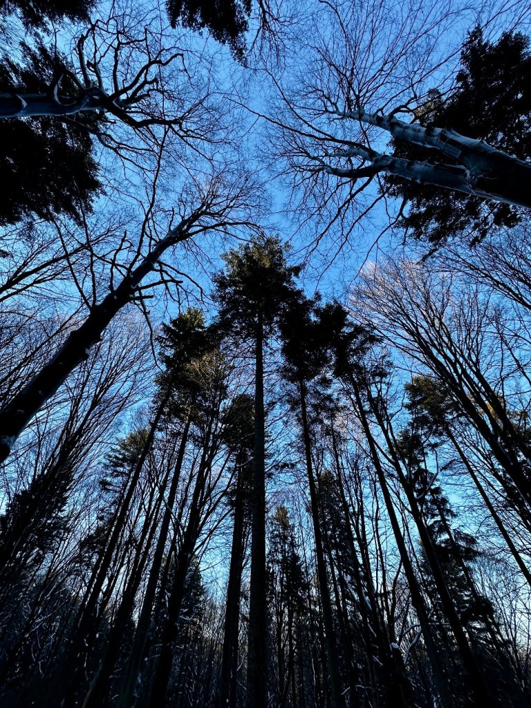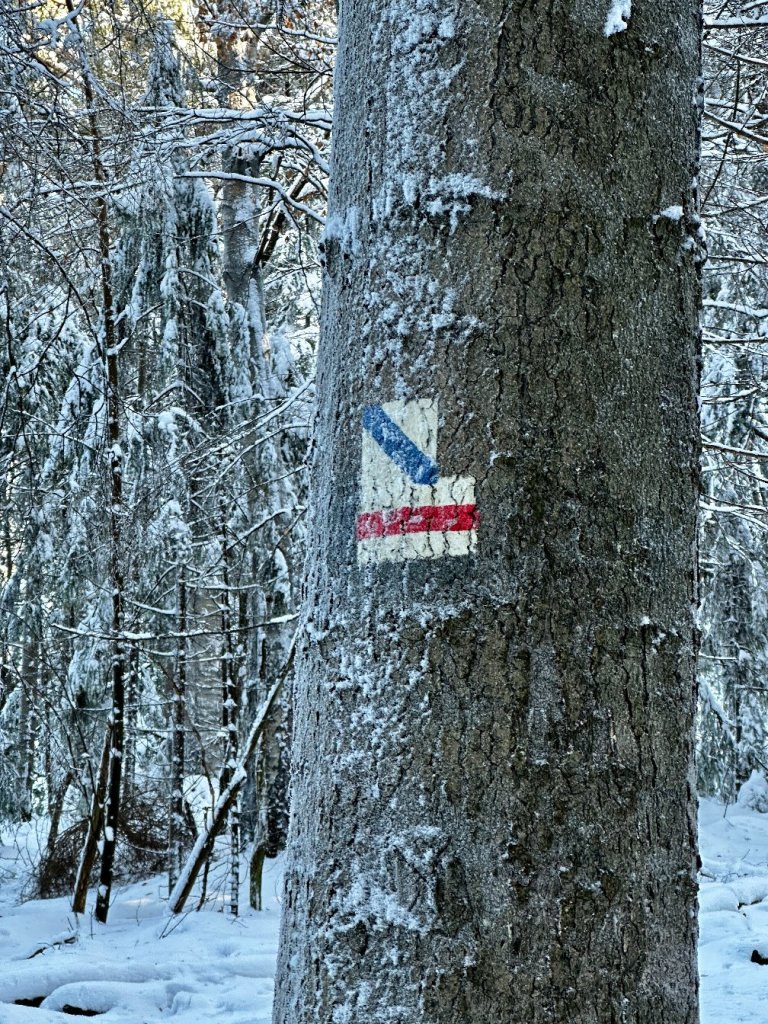 Schodząc ze Skały Agaty, zauważamy zmianę lasu. Mniej śniegu na gałęziach, więcej wysokich drzew liściastych, mniej iglaków. Nadal pięknie, ale inaczej. Szlak się wypłaszcza, robi się spokojniej, ludzi jest już wyraźnie mniej.