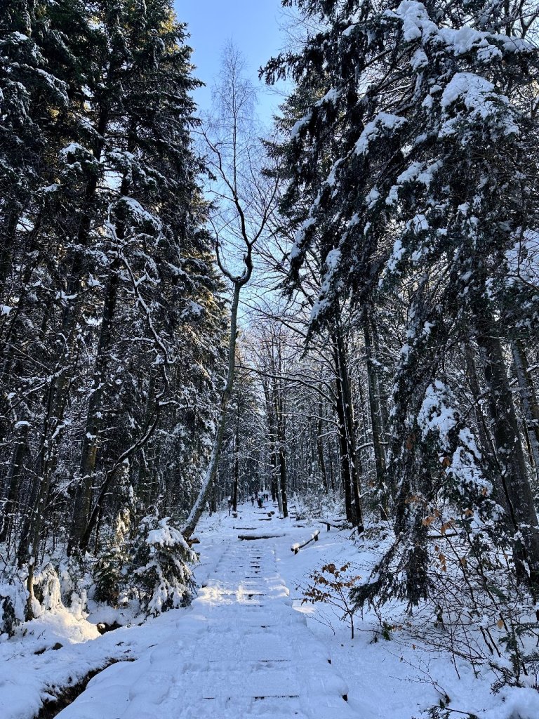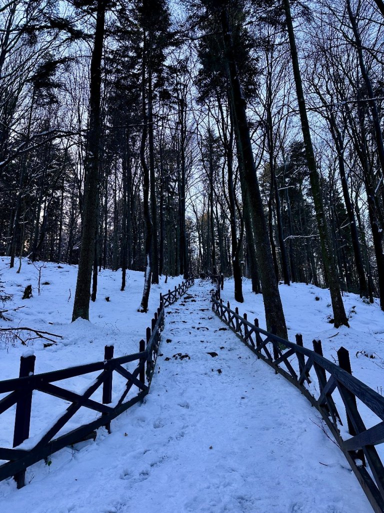 Kolejne schody – kładka i jeszcze więcej śniegu. Im wyżej, tym iglaki są bielsze, a pnie drzew bardziej oszronione.