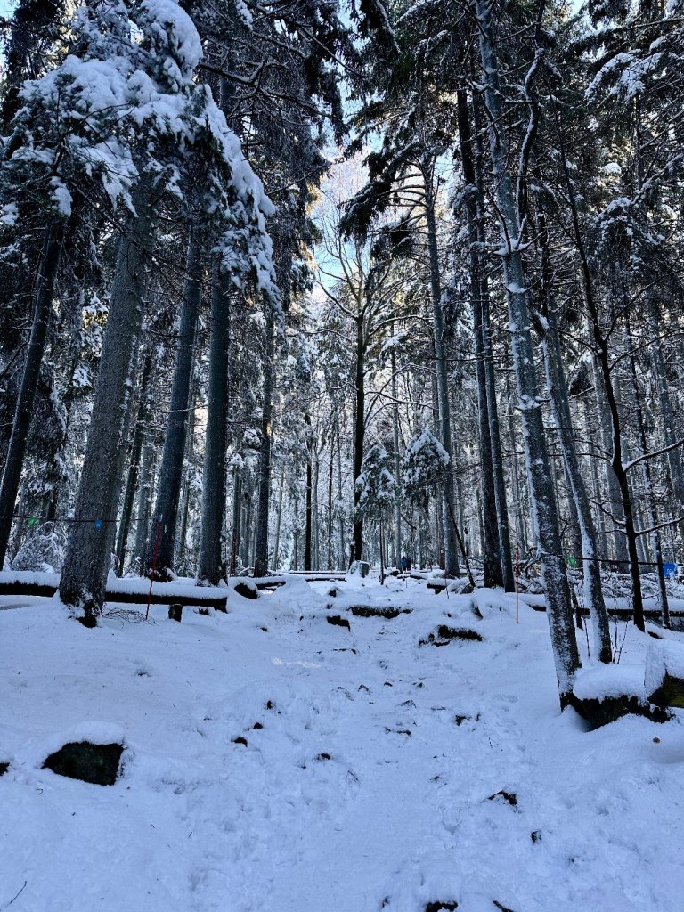 Po odpoczynku planujemy zamknąć pętlę czarnym szlakiem, ale zimą jest on zamknięty do wiosny. Wracamy więc tą samą drogą, spokojnie, bez pośpiechu, wciąż w tym samym bajkowym krajobrazie.