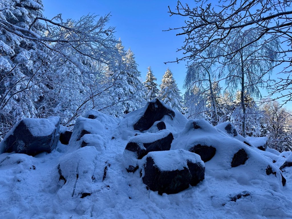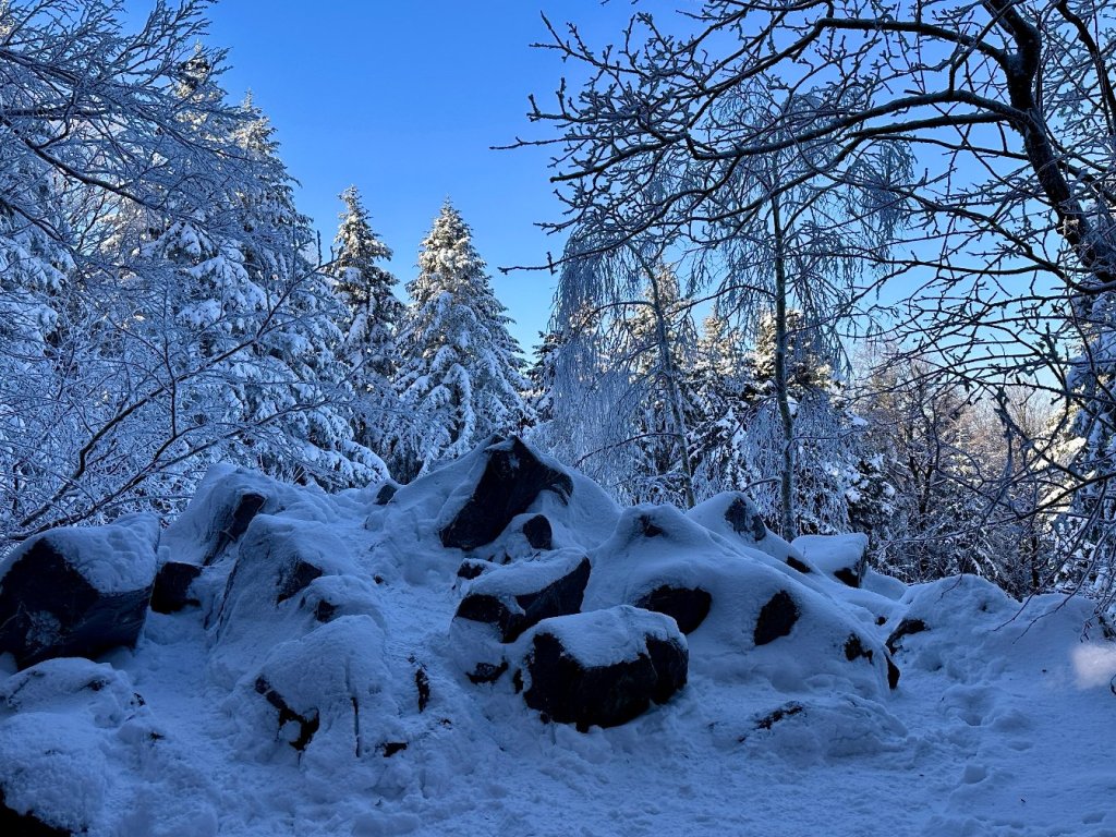 Docieramy do miejsca z widocznym fragmentem gołoborza. Ustawia się kolejka do zdjęć. Ośnieżone kamienie, białe drzewa i niebieska poświata nieba, która barwi śnieg na chłodny błękit, jest przepięknie. Czekamy cierpliwie na swoją kolej.