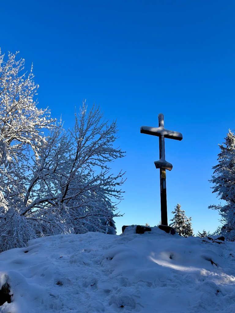 Pod nogami miękkie zaspy, kamieni w ogóle nie widać. Czasem lekko zapadamy się w śnieg, czasem trzeba się z niego „wyciągnąć”. Na miejscu tabliczka jest cała oblodzona i mieni się w słońcu jak szkło.