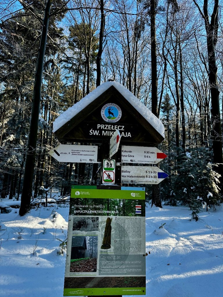Szeroką drogą dochodzimy do przełęczy i kapliczki. Tutaj już jest więcej ludzi. Ktoś robi zdjęcia, ktoś odpoczywa przy stolikach. My też robimy przerwę. Pogoda wciąż sprzyja, a zimowe ptaki umilają ciszę.