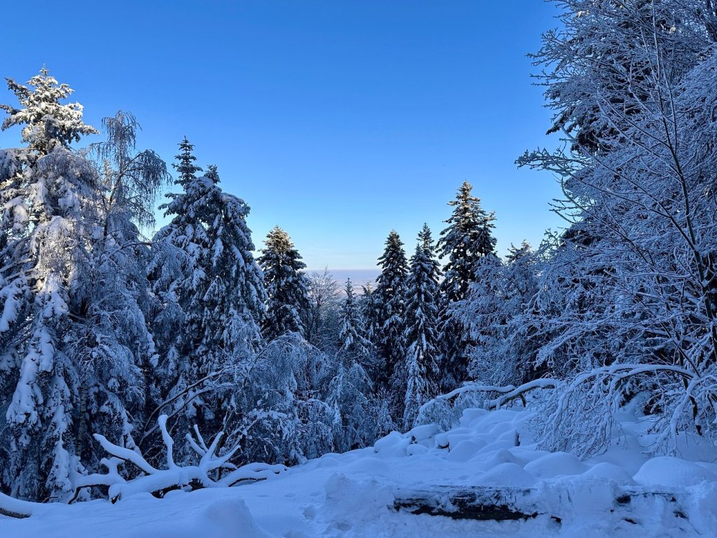 Idziemy dalej, na wyższy wierzchołek, Skałę Agaty. Tutaj robi się wyraźnie ciszej. Drzewa są jeszcze bardziej bajeczne, śniegu więcej, a ludzi mniej.