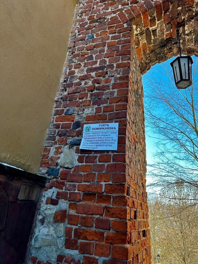Idziemy w stronę Furty Dominikańskiej, potocznie nazywanej uchem igielnym. To wysoki, strzelisty otwór w murach obronnych, otoczony masywną ceglaną konstrukcją. Prowadzą do niego schody w dół, schodzimy nimi, oglądamy furtę z drugiej strony i wracamy tą samą drogą.