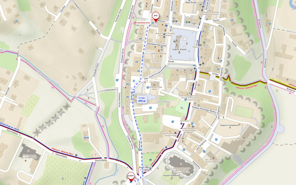 Trasa: Parking – Z parkingu kierujemy się w stronę rynku – Przed rynkiem skręcamy w lewo w ulicę Żydowską – Skręcamy w ulicę Oleśnickich – 20m dalej znajduje się wejście do podziemi – Trasa w podziemiach jest jednokierunkowa, a wyjście znajduje się przy ratuszu – Z rynku wracamy do parkingu – Parking