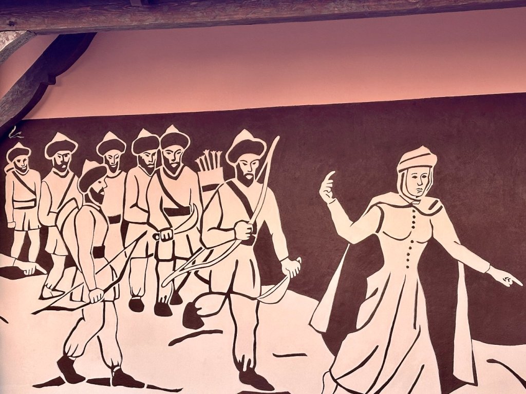 Widzimy wóz z ziołami i produktami spożywczymi. Przewodniczka opowiada o zielarkach i czarownicach, to jeden z ciekawszych fragmentów narracji.